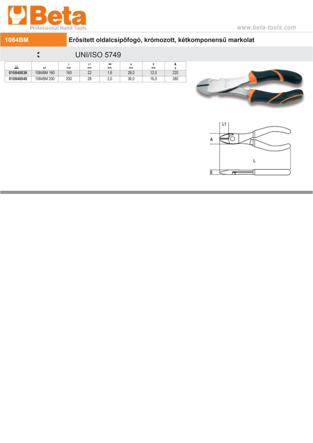 Beta 1084BM 160 Erősített oldalcsípőfogó Bi-materiál szárral