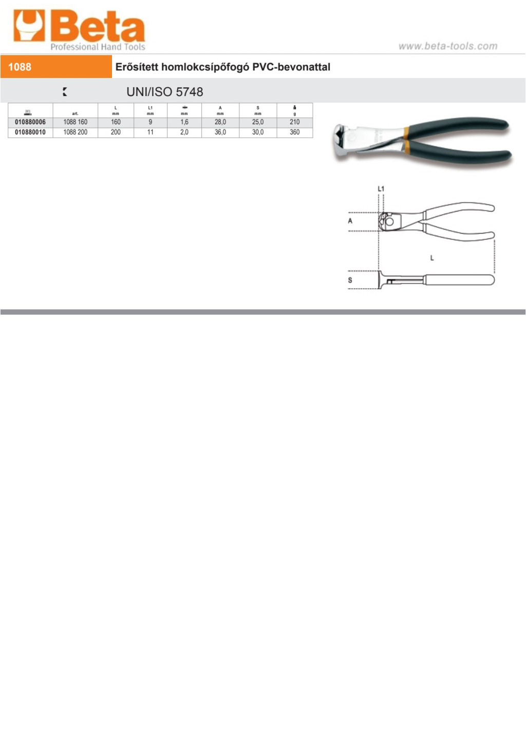 Beta 1088 160 Erősített homlokcsípőfogó PVC-bevonattal