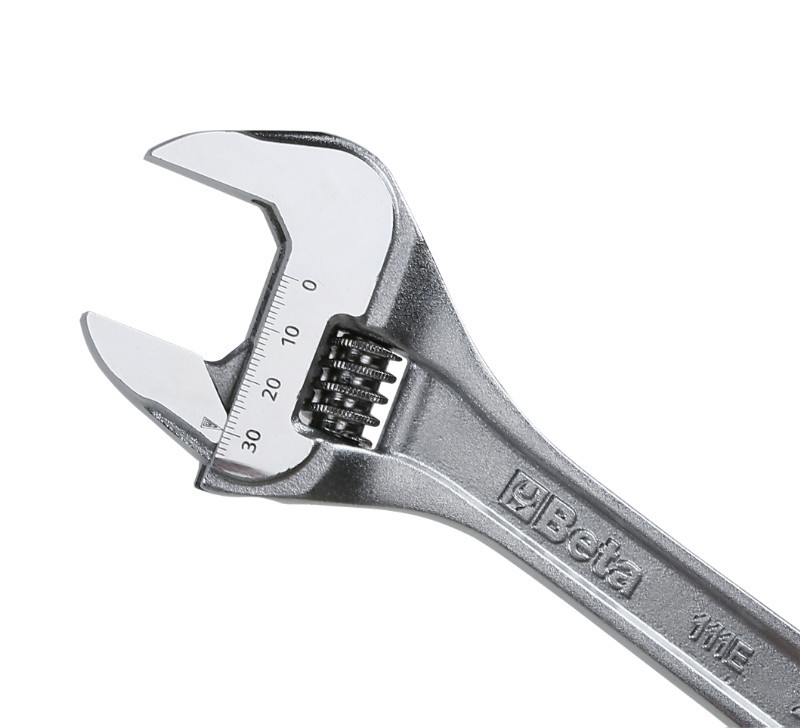 A Beta 111E új, állítható, mérőskálával ellátott villáskulcs fokozatmentesen állítható, így a befogó pofák különböző méretű csavarokhoz méretezhetők.