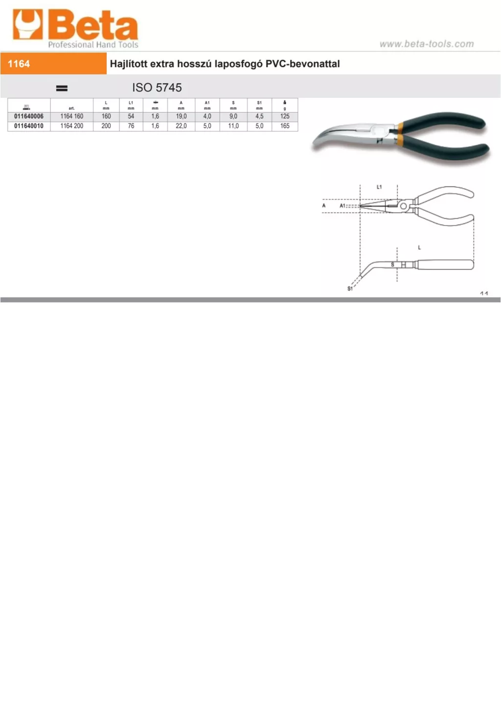 Beta 1164 200 Hajlított extra hosszú laposfogó PVC-bevonattal
