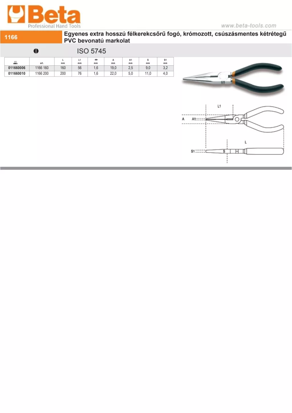 Beta 1166 160 Egyenes extra hosszú félkerekcsőrű fogó PVC-bevonattal