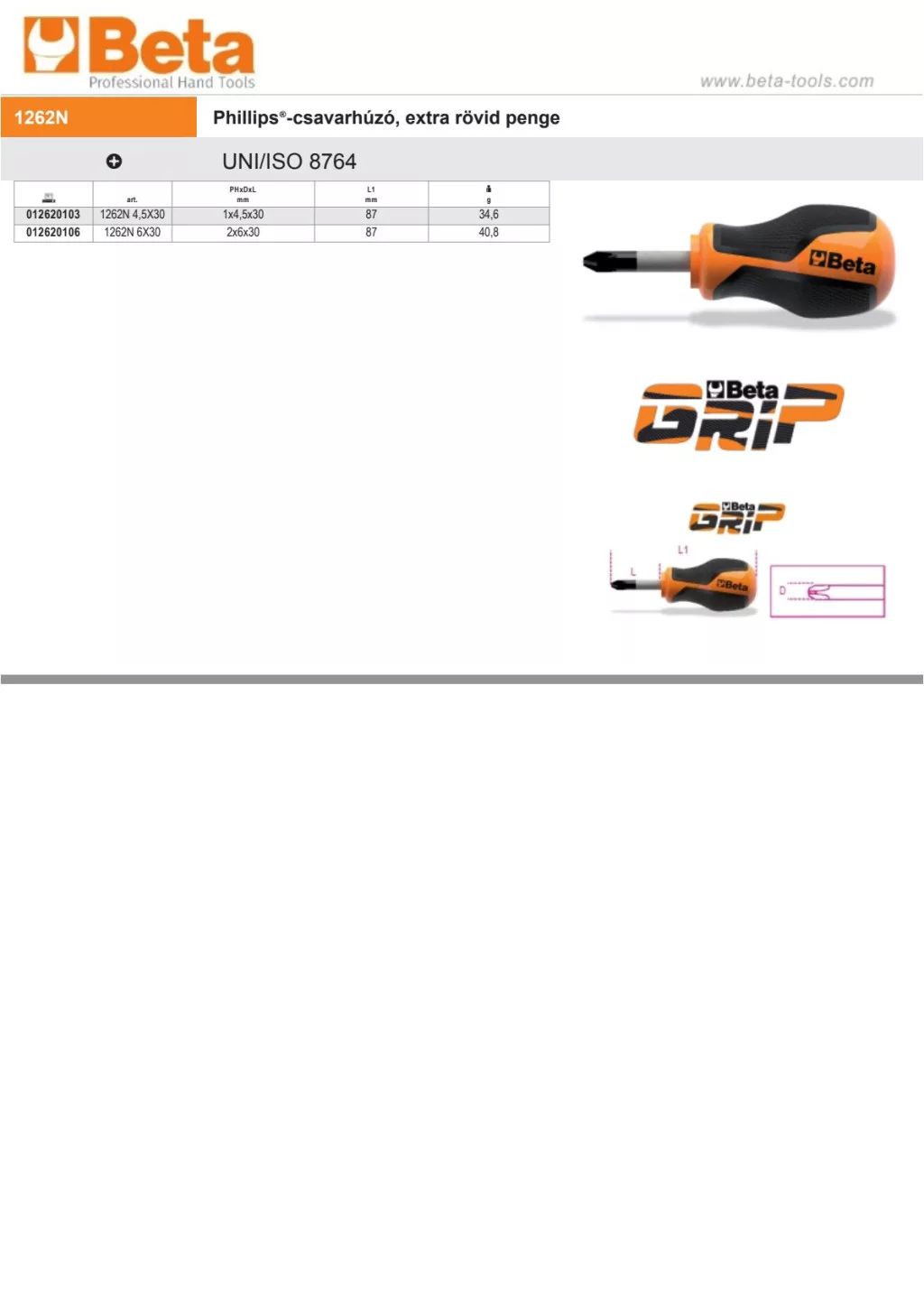 Beta 1262N 6X30 Phillips®-csavarhúzó, extra rövid penge PH2x30mm