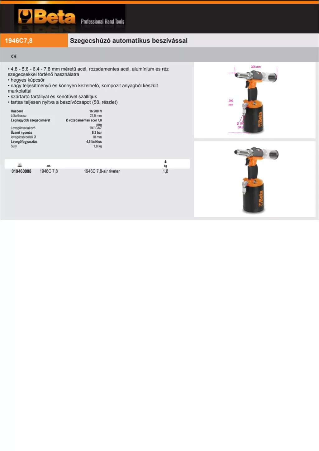 Beta 1946C 7,8 Szegecshúzó automatikus beszívással