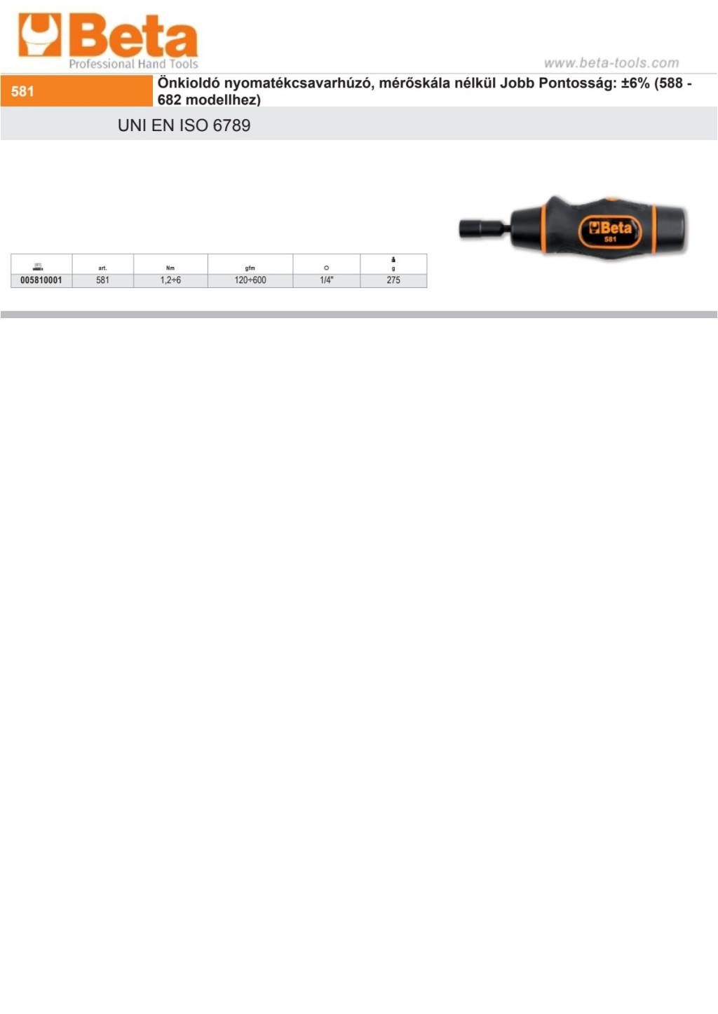 Beta 581 Önkioldó nyomatékcsavarhúzó, mérőskála nélkül Jobb Pontosság: ±6% (588 - 682 modellhez)