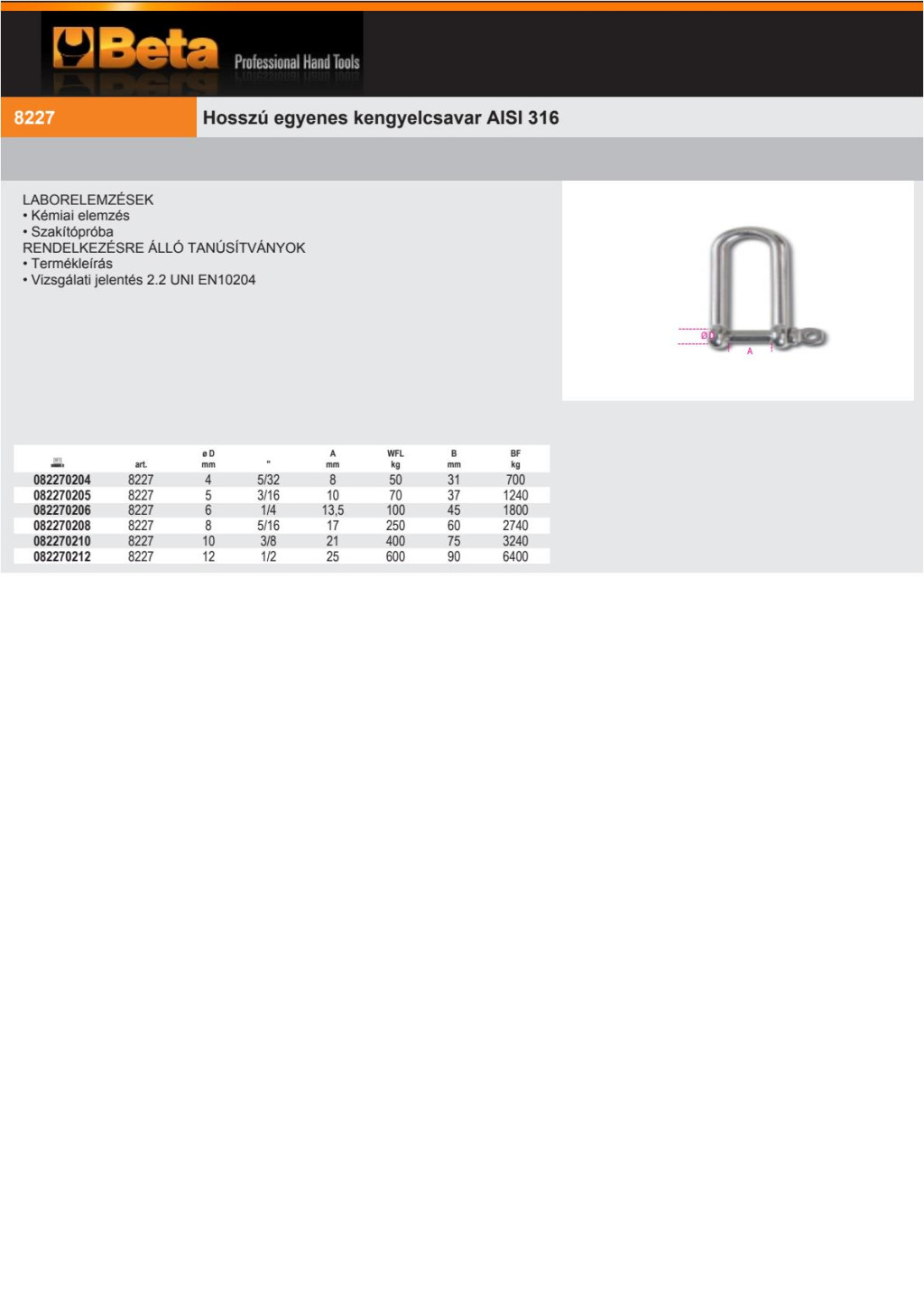 Beta 8227 Hosszú egyenes kengyelcsavar AISI 316 6mm