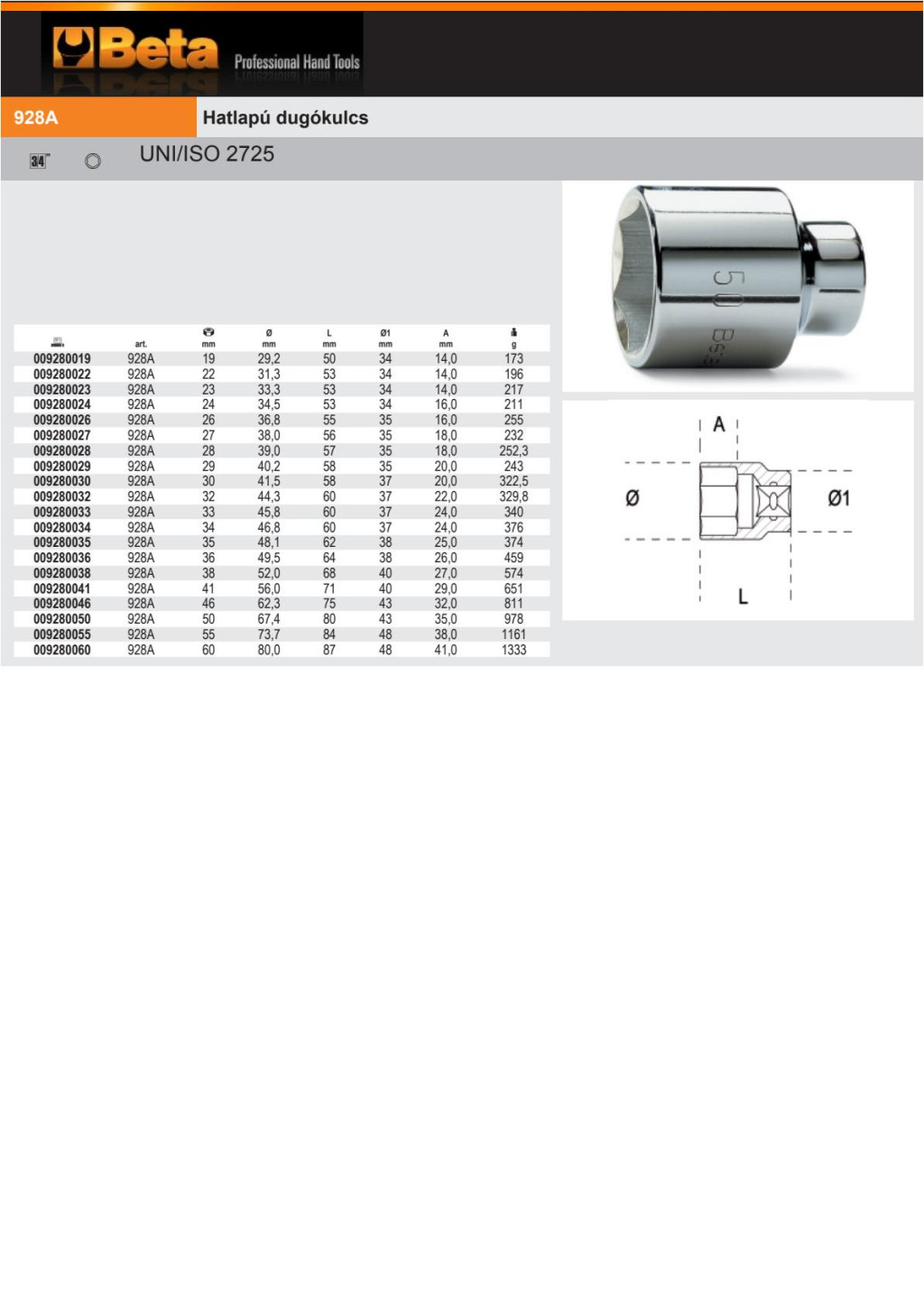 Beta 928A 3/4" Hatlapú Dugókulcs 38mm