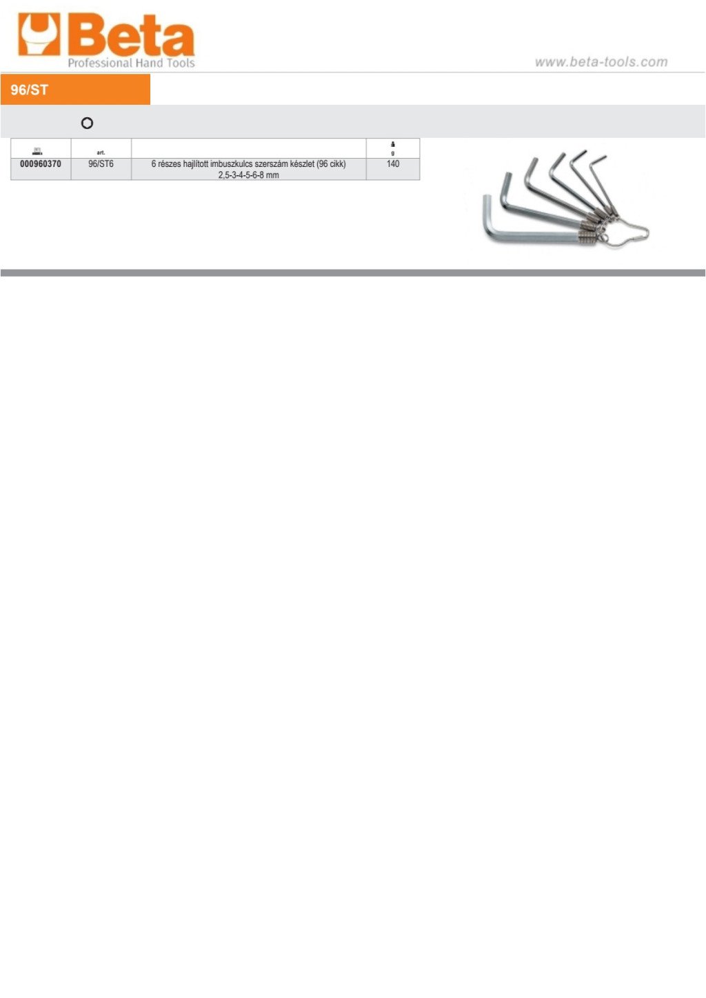 Beta 96/ST6 6 részes hajlított imbuszkulcs szerszám készlet