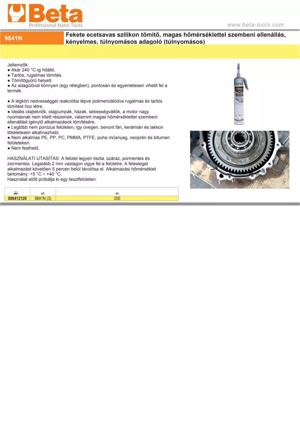 Beta 9841N Fekete ecetsavas szilikon tömítő, magas hőmérséklettel szembeni ellenállás, kényelmes, túlnyomásos adagoló (túlnyomásos) 200ml