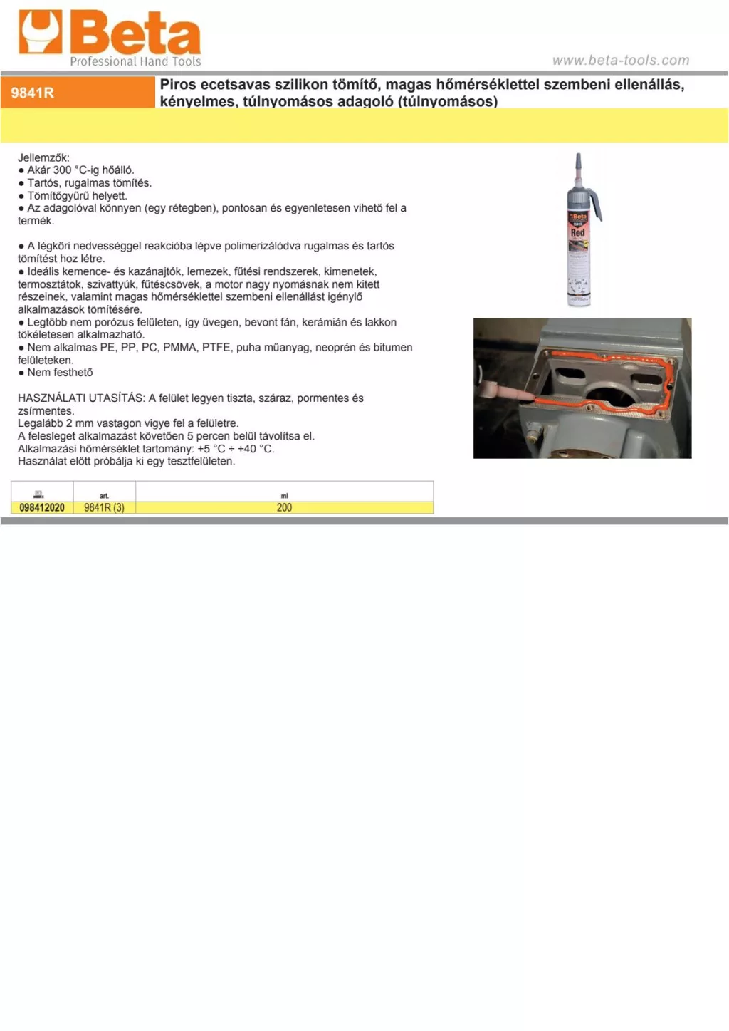 Beta 9841R Piros ecetsavas szilikon tömítő, magas hőmérséklettel szembeni ellenállás, kényelmes, túlnyomásos adagoló (túlnyomásos) 200ml