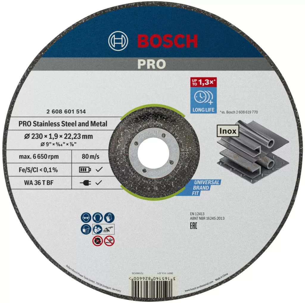Akár 1,3x tovább bírja, mint a Bosch Standard for Metal (2608619769) vágótárcsa - Tartós vágótárcsára van szükséged rozsdamentes acél és fém gyors vágásához a nagy sarokcsiszolóval? A PRO Stainless Steel and Metal megér egy próbát: erős csiszolószemcsékkel biztosítja, hogy kiváló minőségű vágásokat kapj – újra és újra. A PRO Stainless Steel and Metal kötőanyaggal készült vágótárcsa prémium minőségű alumínium-oxid szemcséket használ a szilárdság és tartósság érdekében. A csiszolószemcséket funkcionális töltőanyagokkal kombináltuk, és a szilárdság fokozása érdekében fenolgyantába ágyaztuk be. A vágótárcsát kiváló minőségű üvegszálas hálóval erősítettük meg a biztonságosabb és stabilabb teljesítmény érdekében. Plusz, fémmentessé tettük. Ez azt jelenti, hogy nem kell aggódnod a munkadarab rozsdásodása miatt, ha csak rozsdamentes acélt vágsz. 22,23 mm-es furattal normál rögzítőanyás sarokcsiszolókhoz