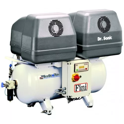 OLAJMENTES fogászati kompresszorok. A MedicAir gépek fogorvosok és fogászati laborok sűrített levegő ellátását biztosítják. A tartálybelső speciális korrózióálló festékkel van bevonva, így a kompresszor által termel sűrített levegő megfelel a felhasználási terület szigorú higiéniai követelményeinek. Jellemzők: 90 literes tartály belső korrózióálló felületkezeléssel - Olajmentes dugattyúk ellenőrzött alapanyagból, nagy teljesítményű hűtőventilátor és kényszerhűtés a maximális hűtési hatékonyság érdekében - Levegő kimeneti szűrő - Dupla fogantyú segíti a mozgást - Motor hővédelem - Hangszigetelt, egyoszlopos szárítóval szerelt kivitel (FM) Dr. Sonic néven rendelhető