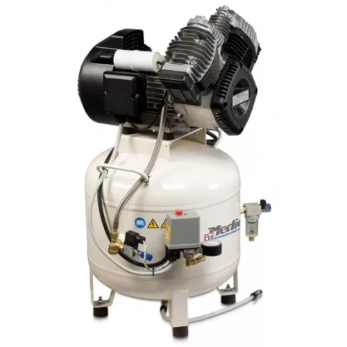 OLAJMENTES fogászati kompresszorok. A MedicAir gépek fogorvosok és fogászati laborok sűrített levegő ellátását biztosítják. A tartálybelső speciális korrózióálló festékkel van bevonva, így a kompresszor által termel sűrített levegő megfelel a felhasználási terület szigorú higiéniai követelményeinek. Jellemzők: -50 literes tartály belső korrózióálló felületkezeléssel - Olajmentes dugattyúk ellenőrzött alapanyagból, nagy teljesítményű hűtőventilátor és kényszerhűtés a maximális hűtési hatékonyság érdekében - Ki-be kapcsoló - Rezgéscsillapító gumibak - Levegő kimeneti szűrő - Dupla fogantyú segíti a mozgást - Motor hővédelem - Hangszigetelt, egyoszlopos szárítóval szerelt kivitel (FM) Dr. Sonic néven rendelhető