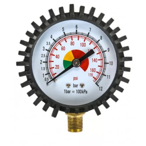 Pneumatikus tömlőfúvatók manométerei. A manométerhez gumi védőburkolat is tartozik, amely megvédi az órát az esetleges sérülésektől. Tizedes beosztású, alsó csatlakozással.