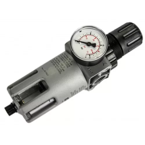 A ,sűrített levegős hálózatba építhető 1/2" szűrő-szabályzó, vízleválasztó egység centrifugál elvű szinterszűrővel van ellátva. A vízleeresztés kézi működtetésű.