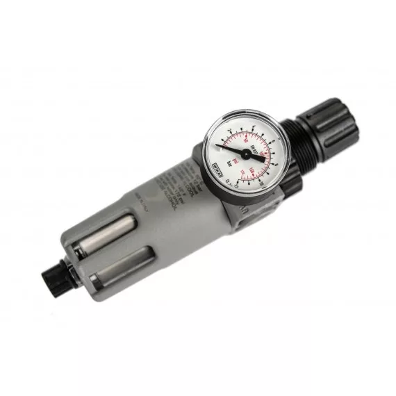 A ,sűrített levegős hálózatba építhető 1/4" szűrő-szabályzó, vízleválasztó egység centrifugál elvű szinterszűrővel van ellátva. A vízleeresztés kézi működtetésű.