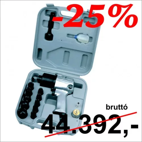 17 részes pneumatikus légkulcs készlet. A készlet tartalma: 1 db WFI-2070 1/2" légkulcs (610 Nm maximális nyomaték, 7.000 RPM fordulatszám), 1 db 5 mm imbuszkulcs, 1 db miniolajzó, 1 db hosszabbítószár (125 mm), 10 db dugókulcs (9, 10, 11, 13, 14, 17, 19, 22, 24, 27 mm), 1 db olajzó, 1 db csatlakozó, 1 db műanyag koffer.