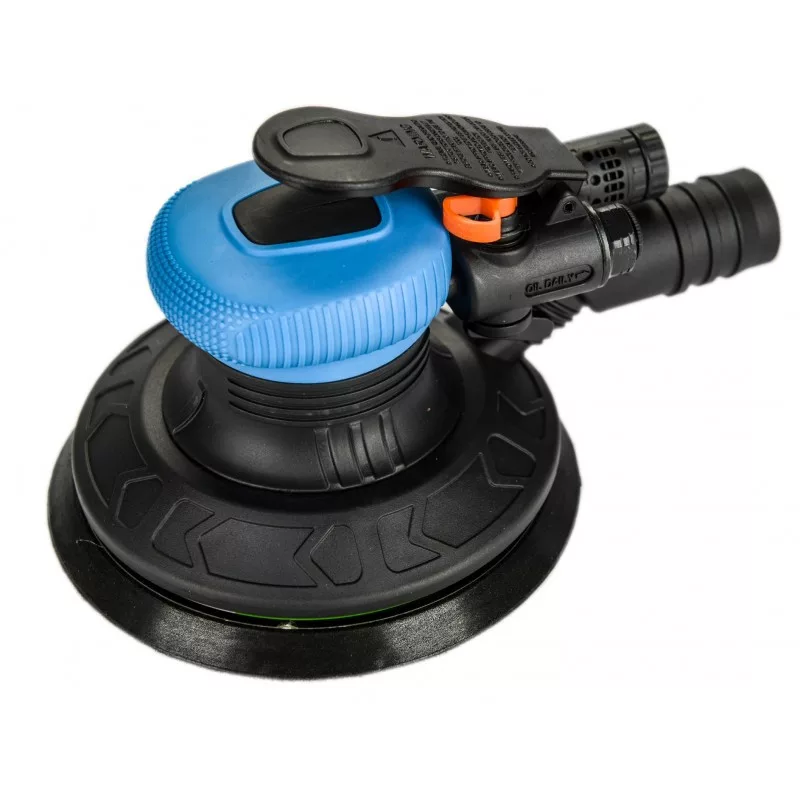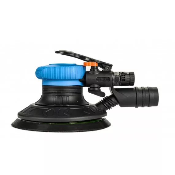 Sűrített levegő meghajtású excenteres csiszológép porelszívással. Egykezes működtetésű csiszológép. Kompakt méreteinek köszönhetően az egyébként nehezen hozzáférhető helyei is könnyen használható. Hátsó munkalevegő elvezetés. Tépőzáras tányérral szerelve. A csiszolótalp mérete 150 mm (6"), a szerszám fordulatszáma 10.500 RPM.