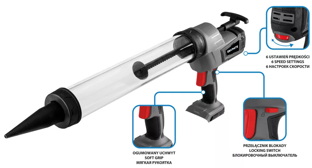 GRAPHITE akkus kinyomópisztoly 600ml-es tartályos kivitel, alutasakos kiszerelésű anyagokhoz, 18V Li-ion. Energy+ akkumulátorokkal kompatibilis. A préselőerő akár 4500 N, a nyomási sebesség pedig 0,7-11 mm/másodperc.Merevített vázas kialakítású. A 6 sebességfokozattal felszerelt gép lehetővé teszi, hogy az aktuális igényeknek megfelelő sebességet válasszon. A csúszásmentes fogantyú és a véletlen benyomás elleni reteszelő mechanizmus tovább növeli a szerszám kényelmét. A kinyomópisztoly ajánlott akkumulátor kapacitása 2 és 4 Ah.