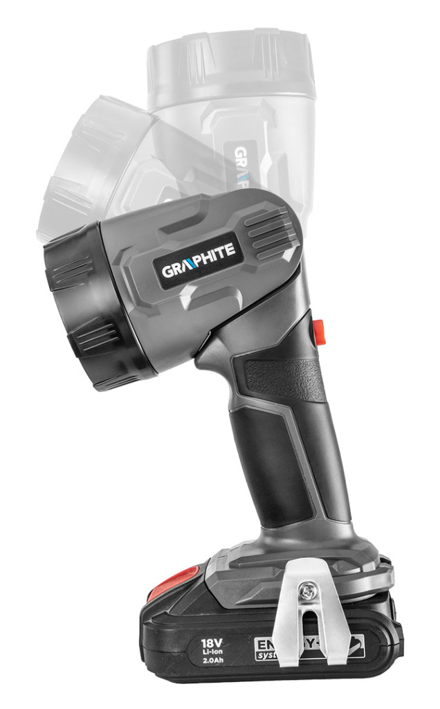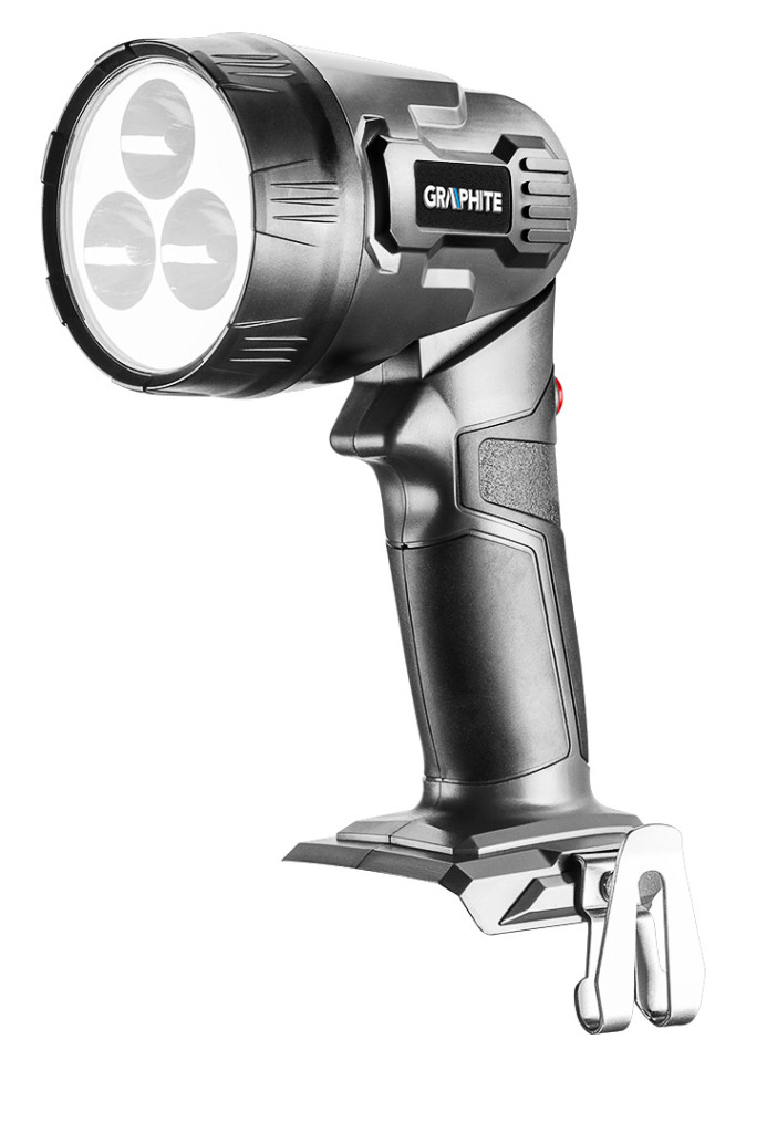 GRAPHITE akkus lámpa, 18V Li-Ion. Energy+ akkumulátorokkal kompatibilis. Három kimagasló minőségű, 7000 K színhőmérsékletű LED diódával ellátva. A diódák széles, 120 fokos vetítő szöggel és nagy, 260 lm fényerősséggel rendelkeznek. A lámpa szerkezetében 5-állású csukló található, melynek révén a fénysugár szöge tökéletesen beállítható a végzett munkához. Az ergonomikus markolat csúszásmentes burkolattal került bevonásra, melynek köszönhetően az elektromos szerszám biztosan fekszik a kézben. A lámpa fém öv akasztóval is rendelkezik.Akkus lámpa 18V, Li-Ion, 3 x LED, színhőmérséklet 7000 K, fényerő 260 lm, vetítési szög 120 fok, (LxH) 140 x 230 mm, tömege 0.3 kg, kompatibilis az Energy+ akkumulátorokkal