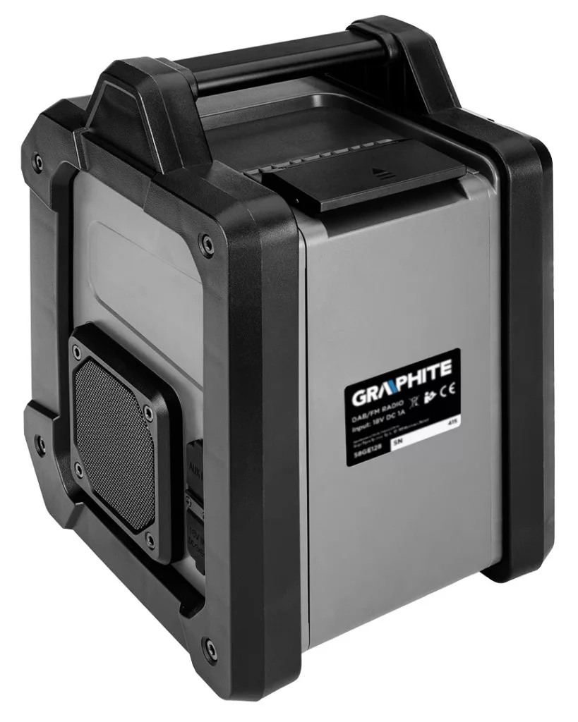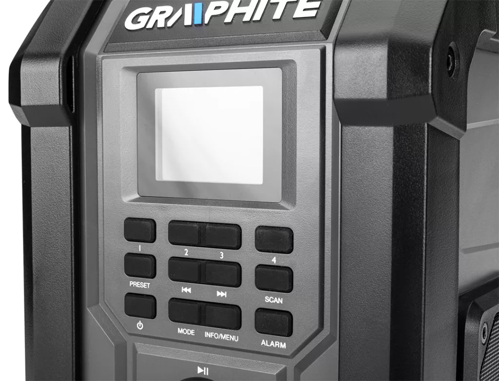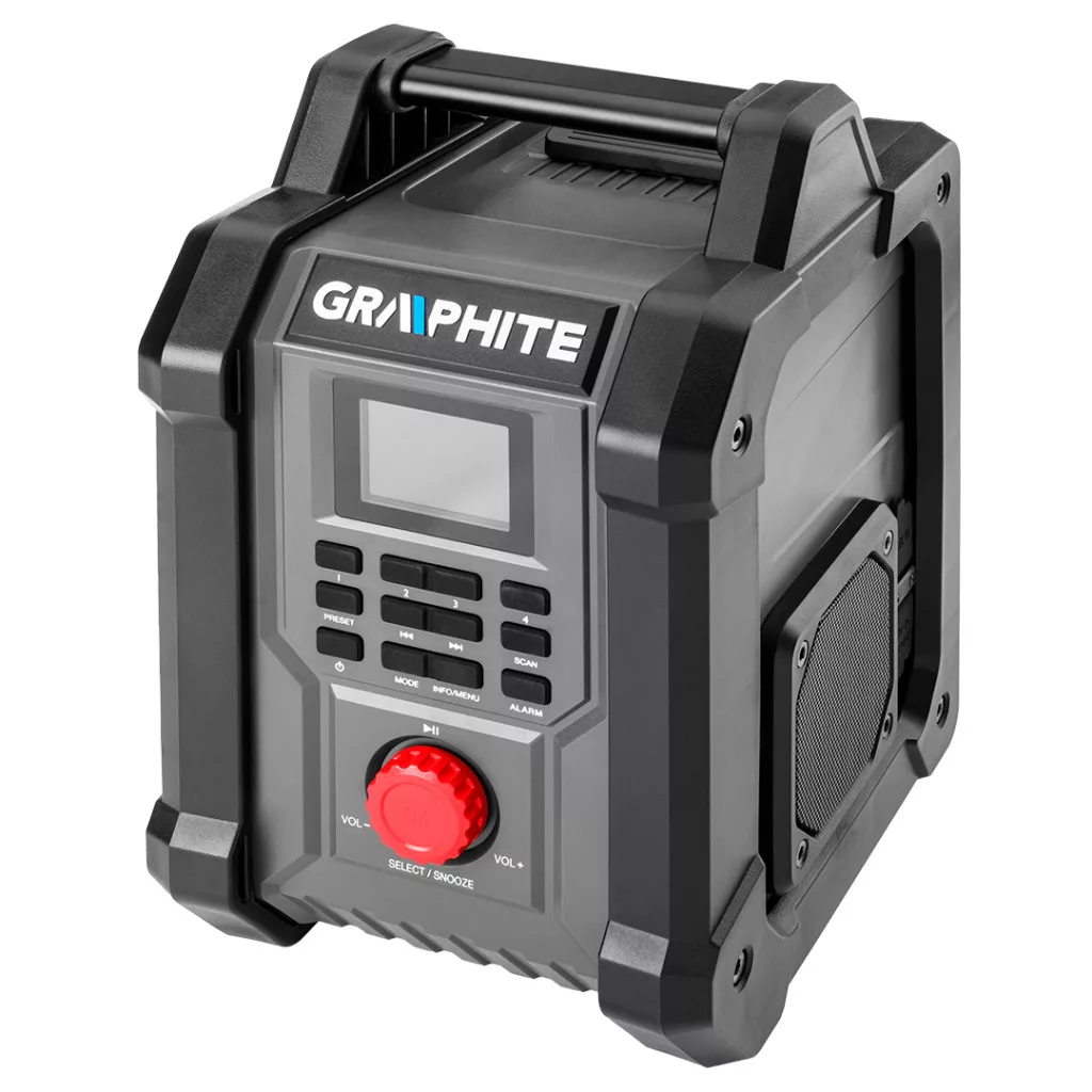 GRAPHITE akkus rádió 18V Li-ion/ hálózati üzemmód. Energy+ akkumulátorokkal kompatibilis. Rádió 2 nagy teljesítményű, 15 W-os hangszóróval, USB- és AUX-csatlakozóval. Az Energy+ rendszer 18 V-os lítium-ion akkumulátoraival és a hálózatra csatlakoztatva is működik. A rádió 30 Fm-állomást (87,5 - 108 mHZ), 30 DAB-állomást (174 - 240 mHz) és Bluetooth 5.0-t támogat. A rádió alvófunkcióval, ébresztővel és automatikus beállítású órával van felszerelve, ami jelentősen növeli a kényelmet. A készülék 2,4 hüvelykes színes kijelzővel is rendelkezik, amely a beállítások egyszerű megváltoztatásához világos és tompított beállítási lehetőségekkel rendelkezik. A borításban lévő telefontartó viszont lehetővé teszi a rádióhoz való kényelmes csatlakoztatást. Remekül használható az építkezésen, a műhelyben vagy a szerelőszolgálatban.