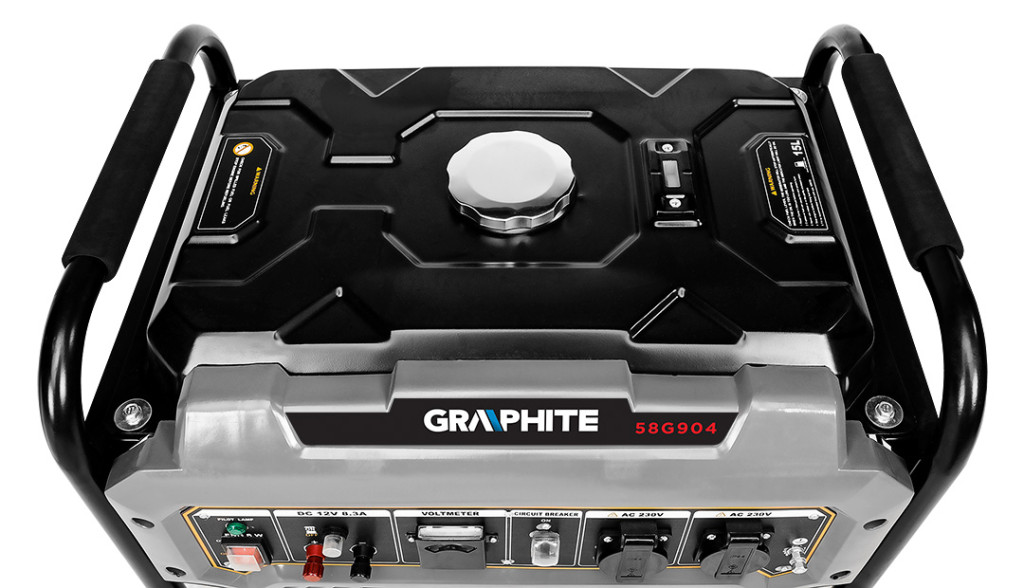 GRAPHITE áramfejlesztő, benzinmotorral. 2 - 2,2 kW elektromos teljesítményű, amelyet különböző típusú elektromos berendezések áramellátására terveztek olyan területeken, ahol nincs állandó hozzáférés a hálózathoz. Erős, 4,8 kW/6,5 LE teljesítményű, négyütemű benzinmotorral felszerelt, és kézi indítózsinórral indítható. 15 literes üzemanyagtartállyal és 0,6 literes olajtartállyal rendelkezik. Átlagos üzemanyag-fogyasztása 2,44 l/h, minimális égési értéke pedig 360 g/kWh. Megfelel az EURO V szabványoknak, és beépített AVR-rendszerrel rendelkezik, amely hatékonyan stabilizálja a feszültséget a kimeneti aljzaton, valamint túláramvédelemmel. Méretei védőállvánnyal együtt 605 x 445 x 455 mm, súlya 41 kg. Eléri a 3000 fordulat/perc fordulatszámot, a hengerűrtartalma 196 cm3, LwA=95 dB. F6RTC gyújtógyertya típus beépítve és 1x 12V + 2x230V (16A) aljzat. Számos alkalmazáshoz ajánlott.