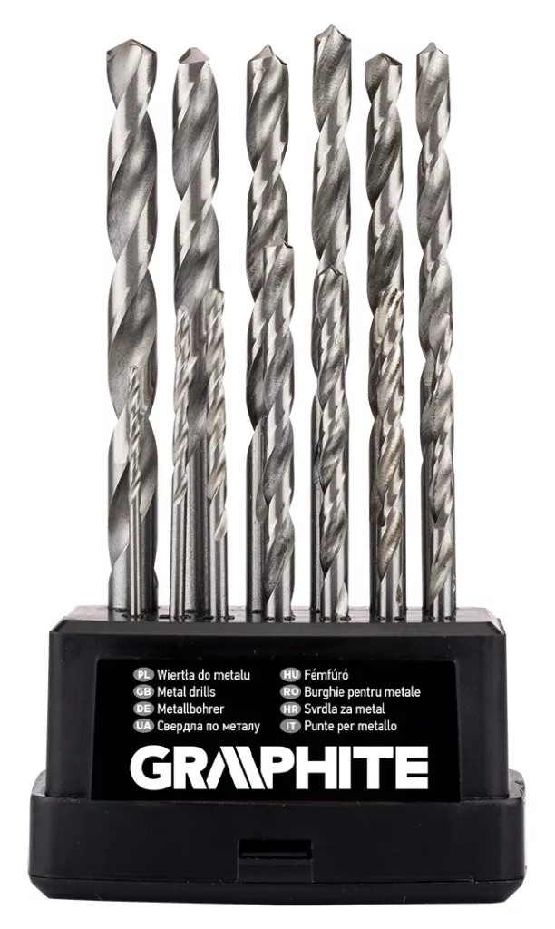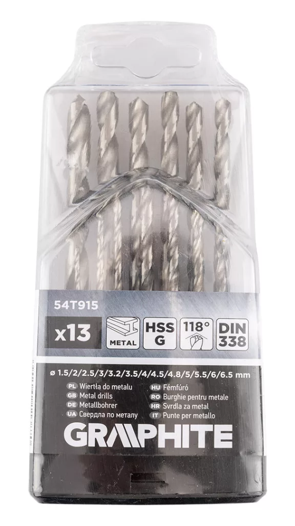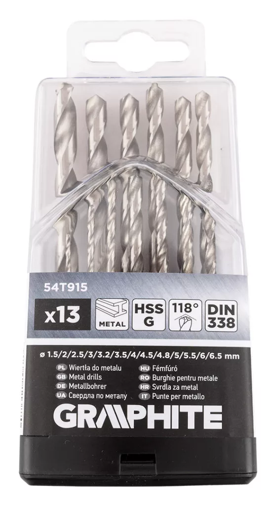 A GRAPHITE 54T915 HSS-G fémfúrószár készlet 13 darab fúrószárat tartalmaz, amelyek 1,5, 2, 2,5, 3, 3,2, 3,5, 4, 4,5, 4,8, 5, 5,5, 6 és 6,5 mm átmérőjűek.