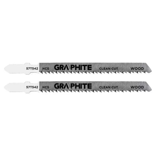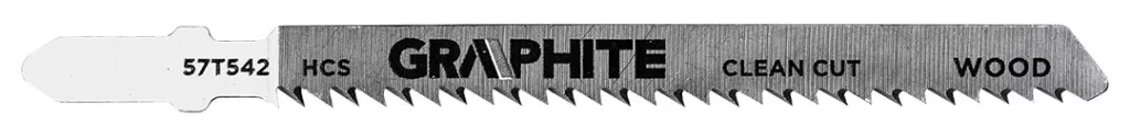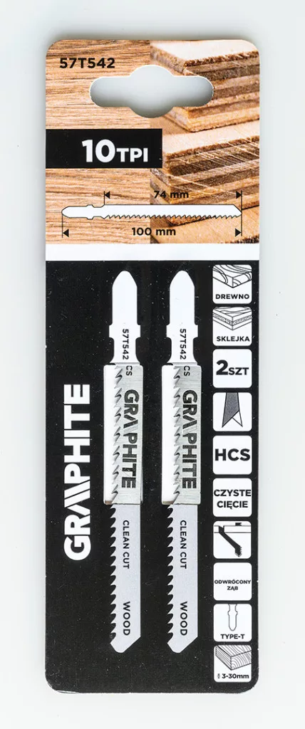 Dekopírfűrészlap, 10 TPI, HCS, T-befogású, 2 db, fordított fogazat, tiszta vágás 57T542 a GRAPHITE-tól 10 TPI fogsűrűségű Dekopírfűrészlap, HCS-ből készült és T-befogásútal van ellátva. A készlet 2 darabot tartalmaz. Teljes hossza 100 mm, munkahossza 74 mm, szélessége 8 mm, vastagsága 1,5 mm, fogazati távolsága 2,5 mm. Alkalmas puhafa, forgácslap, asztalos rétegelt lemez, 3-30 mm vastagságú farostlemez és rétegelt lemezek vágására. A GRAPHITE márkájú penge fordított fogazással rendelkezik a tiszta vágás érdekében.
