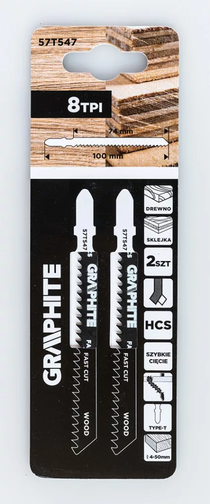 Dekopírfűrészlap, 8 TPI, HCS, T-típusú befogással, 2 db, durva vágás 57T547 a GRAPHITE-tól egy 8 TPI fogazási sűrűségű kirakófűrész szerszám. HCS anyagból készült, T típusú befogássalval rendelkezik. 2 darabos készletben kerül forgalomba. A GRAPHITE márkájú fűrészlap teljes hossza 100 mm, munkahossza 74 mm, szélessége 9,2 mm, vastagsága 1,2 mm, fogazási távolsága 3 mm. Jellemzője, hogy széles körben alkalmazható puhafa (4-50 mm), forgácslap, ácsolt rétegelt lemez és farostlemez megmunkálásához. Gyors és durva vágásra tervezték.