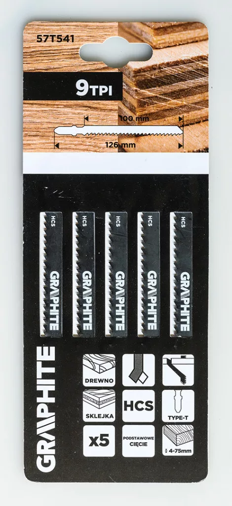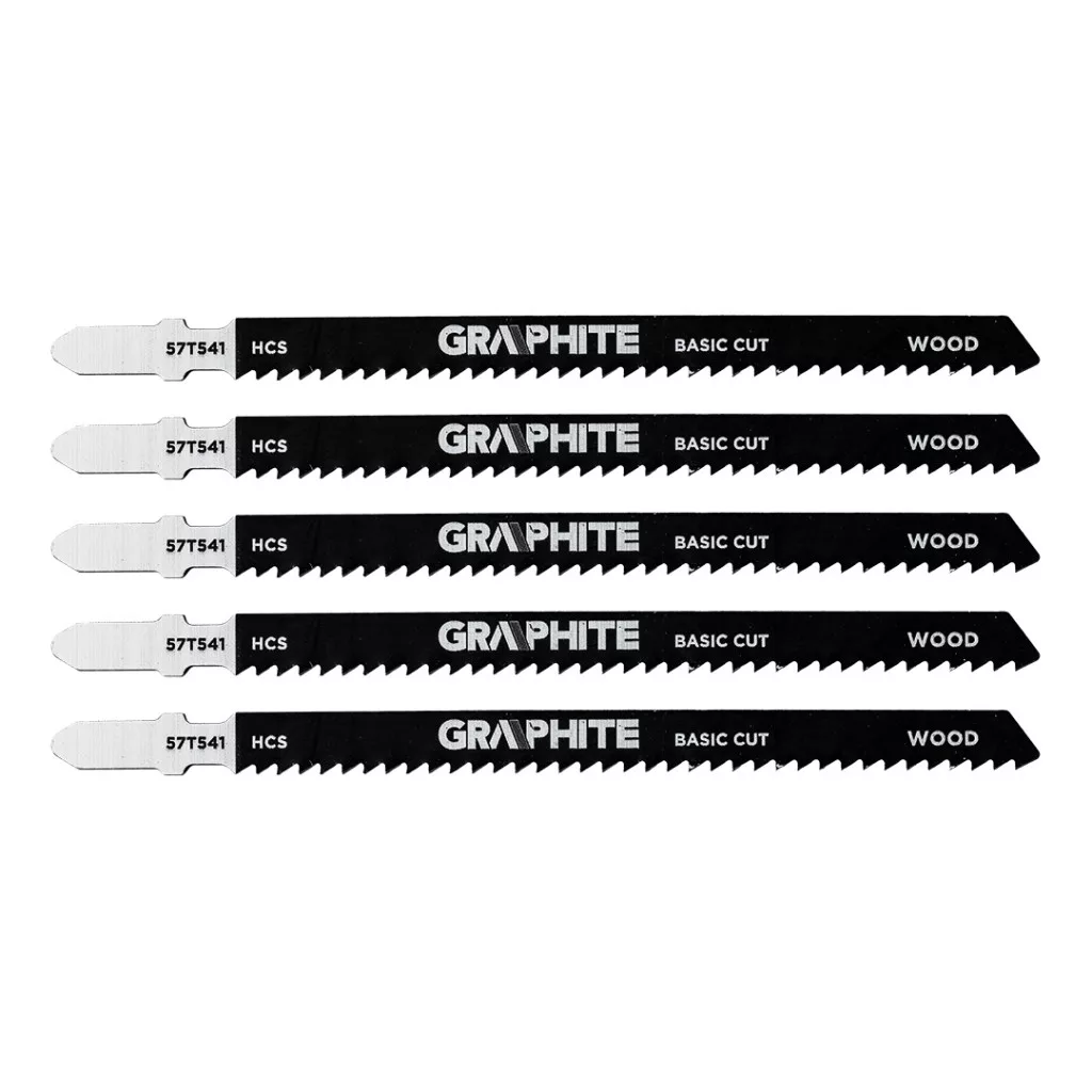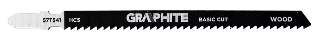 Dekopírfűrészlap készlet, 9 TPI, HCS, T-befogású, 5 db. A GRAPHITE 57T541 5 db 9 TPI fogsűrűségű, szívós szénacélból (HCS) készült szúrófűrészlapot tartalmaz. Mindegyik penge teljes hossza 126 mm, munkahossza 100 mm, szélessége 8 mm, vastagsága 1,2 mm és fogköze 2,75 mm. Ezeket a lapokat puhafa (4-75 mm-es tartományban), forgácslap, ácsréteg és farostlemez alapvágására tervezték. A GRAPHITE márkájú készlet alkalmasnak bizonyul a mindennapi kirakósfűrész használatra a különböző faalapú anyagok megmunkálásakor.