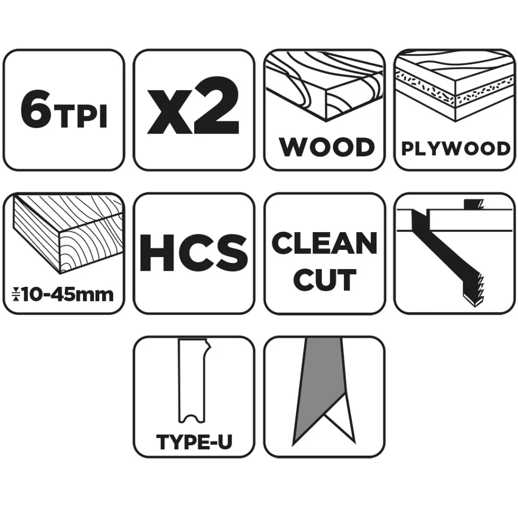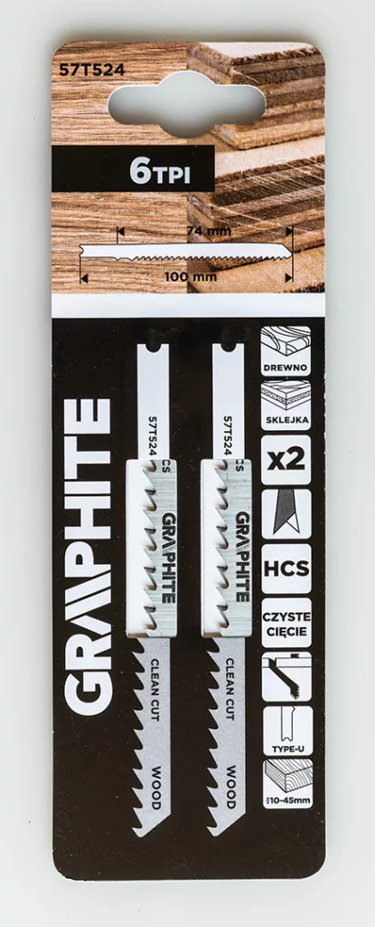 Dekopírfűrészlap, 6 TPI, HCS, U - típusú befogással, 2 db, tiszta vágás 57T524 a GRAPHITE-tól egy 6 TPI fogsűrűségű, HCS-ből készült, U - típusú befogássalval ellátott Dekopírfűrészlap. A készlet 2 darabot tartalmaz. Teljes hossza 100 mm, munkahossza 74 mm, szélessége 8 mm, vastagsága 1,5 mm, fogazati távolsága 4 mm. Alkalmas 10-45 mm vastagságú puhafa, forgácslap, asztalos rétegelt lemez és farostlemez vágására. A GRAPHITE márkájú penge tiszta vágást tesz lehetővé.