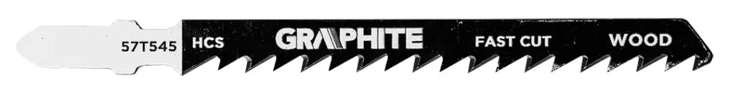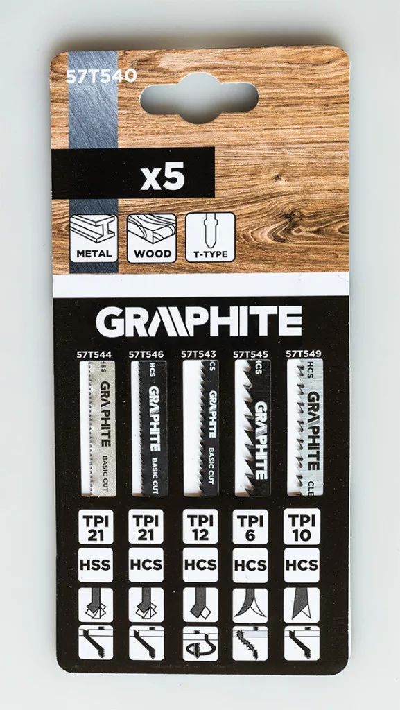 Dekopírfűrészlap készlet, 6 TPI, 10 TPI, 12 TPI, 20 TPI, HCS, T-befogású, 5 db. 57T540 GRAPHITE által gyártott készlet, amely a következőket tartalmazza: 1x 57T543 szúrófűrészlap, 12 TPI fogsűrűséggel, HCS anyaggal és T típusú fogantyúval. Jellemzője a 76 mm teljes hossz, 50 mm munkahossz, 5,2 mm szélesség, 1 mm vastagság és 2 mm fogosztás. Alkalmazások: puhafa (2-15 mm), rétegelt lemez, forgácslap, ácsolt rétegelt lemez, farostlemez, íves vágásokhoz, alapvágáshoz. A GRAPHITE készlet tartalmaz továbbá 1x 57T544 szúrófűrészlapot, 21 TPI fogsűrűséggel, HCS anyagból és T alakú fogantyúval. A készlet 2 darabját 76 mm teljes hossz, 50 mm munkahossz, 8 mm szélesség, 1 mm vastagság és 1,2 mm fogköz jellemzi. Alkalmazás: vékony fémlemezek (1-3 mm), alapvágás. A készlet 1x 57T545 szúrófűrészlapot is tartalmaz, 6 TPI fogsűrűséggel, HCS anyagból és T alakú fogantyúval. Szerszám teljes hossza 100 mm, munkahossza 74 mm, szélessége 8 mm, vastagsága 1,2 mm és fogosztása 4 mm. Alkalmazás: puhafa (5-50 mm), forgácslap, rétegelt lemez, farostlemez, gyors vágás, durva vágás. A készlet tartalmaz továbbá 1x 57T546 szúrófűrészlapot, fogsűrűség 21 TPI, HCS anyag és T alakú fogantyú. Teljes hossz 76 mm, munkahossz 50 mm, szélesség 8 mm, vastagság 1 mm és fogosztás 1,2 mm. Alkalmazások: puhafa (1,5-15 mm), rétegelt lemez, forgácslap, ácsolt rétegelt lemez, farostlemez, alapvágás. A GRAPHITE márkakészlet 1x 57T549 szúrófűrészlapot is kínál, 10 TPI fogsűrűséggel, HCS anyaggal és T alakú fogantyúval. Teljes hossza 100 mm, munkahossza 74 mm, szélessége 8 mm, vastagsága 1,5 mm, fogazati távolsága 2,5 mm. Alkalmazások: puhafa, forgácslap, asztalos rétegelt lemez, farostlemez (3-30 mm), műanyag/epoxi (átmérő <30 mm), tiszta vágás.