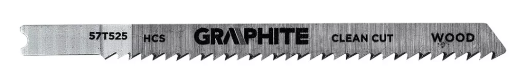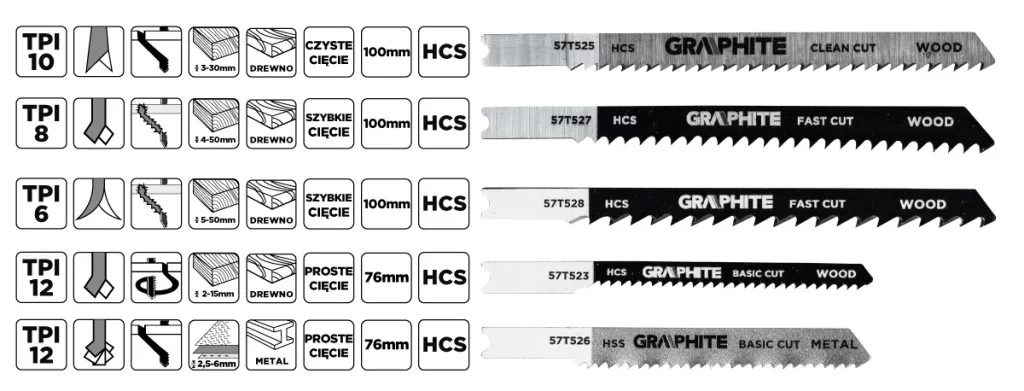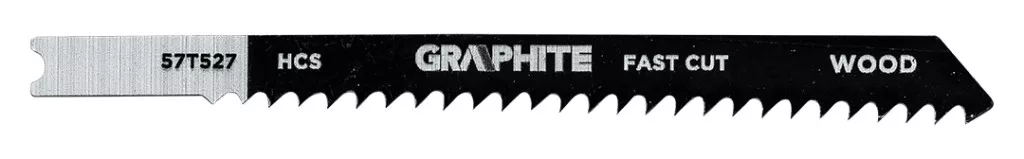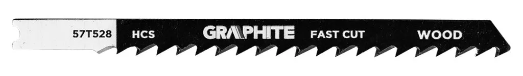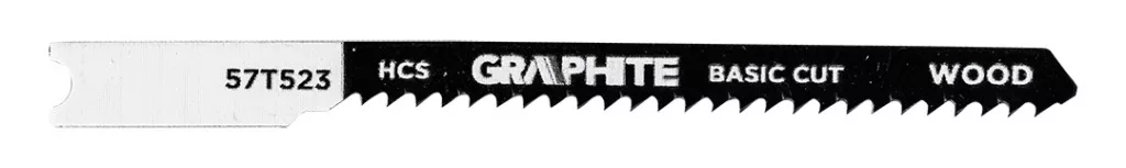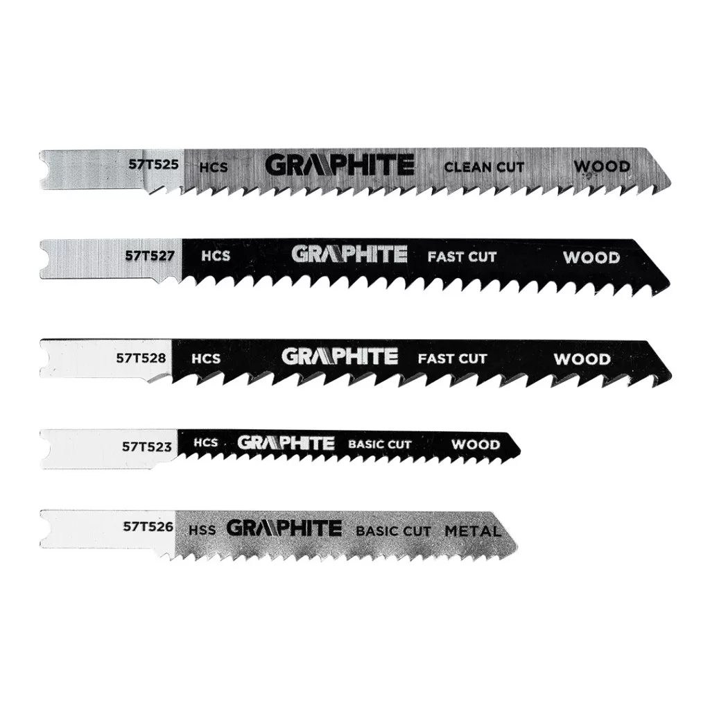 Dekopírfűrészlap készlet, 6 TPI, 8 TPI, 10 TPI, 12 TPI, HCS, U - típusú befogással, 5 darab 57T520 a GRAPHITE-tól 5 féle, különböző célú és műszaki paraméterű lapot tartalmaz. A készlet többek között az 57T526 pengét tartalmazza - nagysebességű acélból (HSS) készült, 12 TPI fogazási sűrűséggel, 76 mm teljes hosszal és 50 mm munkahosszal, alapvető fémvágáshoz, beleértve a 2,5-6 mm vastagságú, közepesen vastag fémlemezeket is. A másik az 57T523 - egy HCS penge ugyanolyan méretekkel és fogazással, amelyet puhafa (2-15 mm), rétegelt lemez, forgácslap, farostlemez és ácslapok vágására hoztak létre, ideális íves vágásokhoz. Az 57T528-as modell egy GRAPHITE márkájú HCS 6 TPI kés, amelynek teljes hossza 100 mm, munkahossza pedig 74 mm, és amelyet puhafa (5-50 mm), rétegelt lemez, farostlemez és forgácslap gyors, durva vágására terveztek. Tartalmazza továbbá az 57T527 - HCS 8 TPI pengét is, hasonló méretekkel, puhafa (4-50 mm), forgácslap, ácsolt rétegelt lemez és farostlemez durva vágásához. Az utolsó tétel az 57T525 - HCS 10 TPI, fa (3-30 mm), forgácslap, rétegelt lemez, farostlemez, valamint műanyag és epoxi tiszta vágásához 30 mm átmérőig. Minden GRAPHITE márkájú penge U - típusú befogássalval rendelkezik, és a legtöbb népszerű kirakósfűrészhez alkalmas.