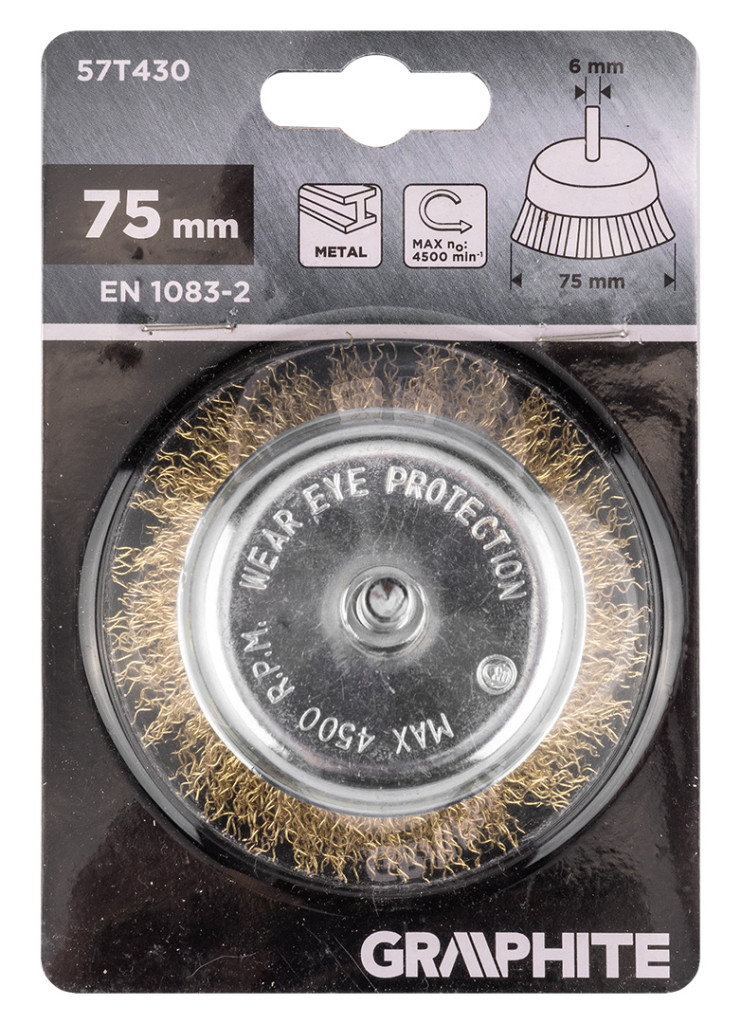 A GRAPHITE 57T430-as 75 mm-es, krimpelt drótból készült, 6 mm-es szárú, rézsútos drótból készült 75 mm-es, rézsútos kefe 57T430-as szárú, rézsútos drótból készült. Maximális fordulatszáma 4500 fordulat/perc. A termék megfelel az EN 1083-2 szabvány követelményeinek, és 6 mm-es szárral rendelkezik, hogy bármilyen fúróval vagy csavarozógéppel működtethető legyen. A GRAPHITE drótkefe sokoldalúan felhasználható termék számos feladathoz.