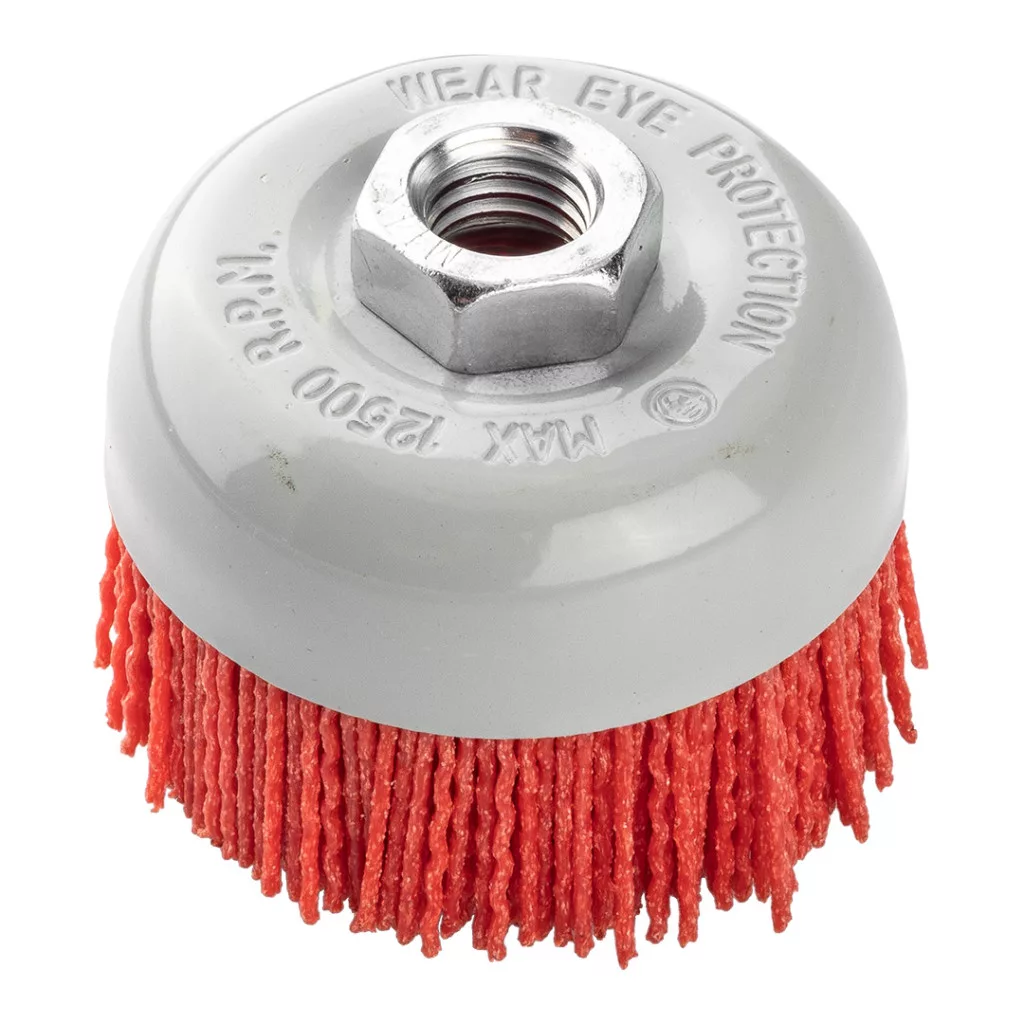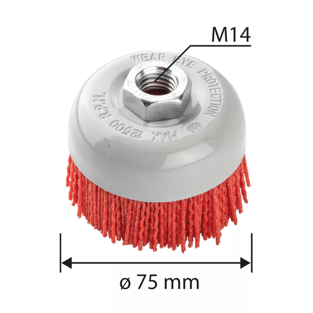 A GRAPHITE 75 mm átmérőjű, M14, 57T425 nylon tompa kefe nylonból készült. M14-es menettel van ellátva, és sarokcsiszolókkal való használatra tervezték. A szerszám maximális fordulatszáma 12500 rpm. A termék megfelel az EN 1083-2 szabványnak, és jól használható a felületek érdesítéséhez, tisztításához, festék vagy szennyeződés eltávolításához.