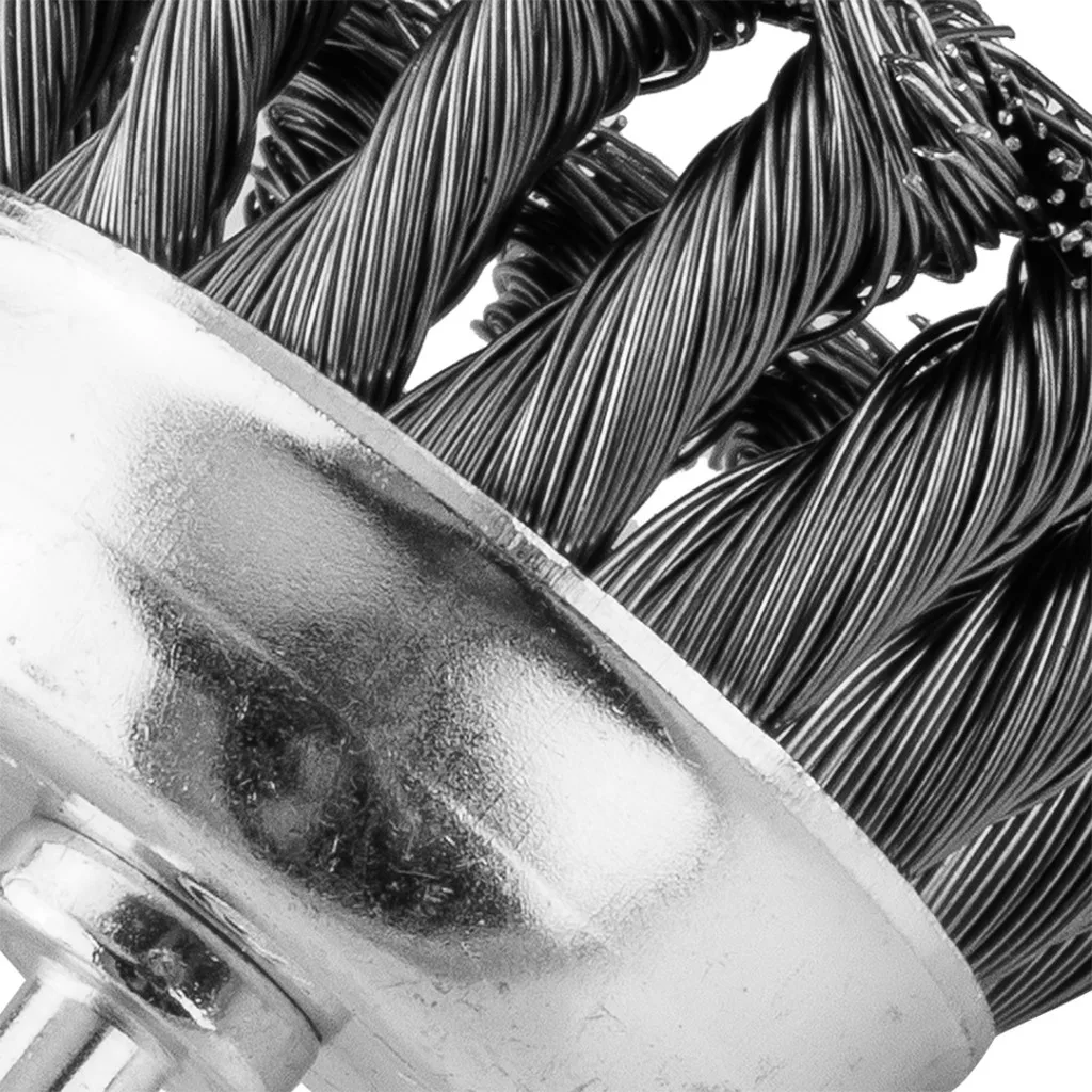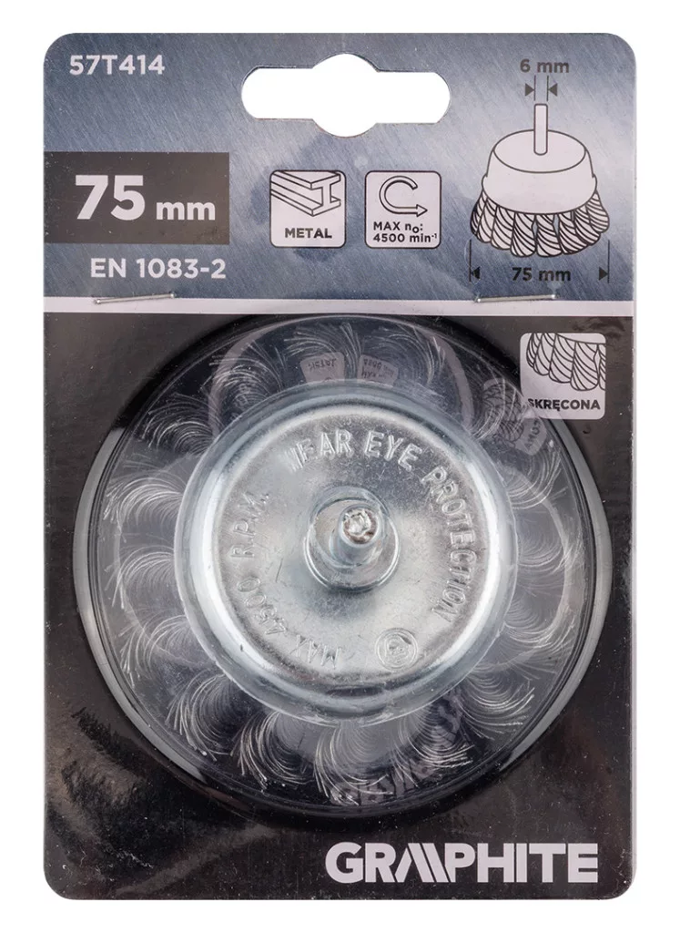 A GRAPHITE 75 mm-es, sodrott huzalból készült, 6 mm-es szárú 57T414-es acél tompa kefe sodrott acélhuzalból készült. Maximális fordulatszáma 4500 rpm. A termék megfelel az EN 1083-2 szabvány követelményeinek, és 6 mm-es szárral rendelkezik, így bármilyen fúróval vagy csavarozógéppel használható. A GRAPHITE drótkefe sokoldalúan felhasználható termék számos feladathoz.