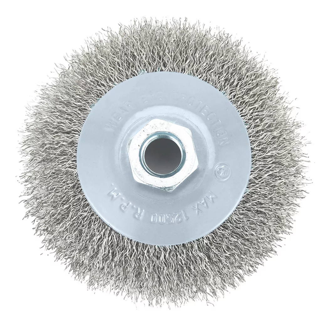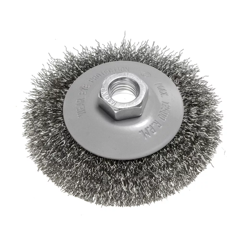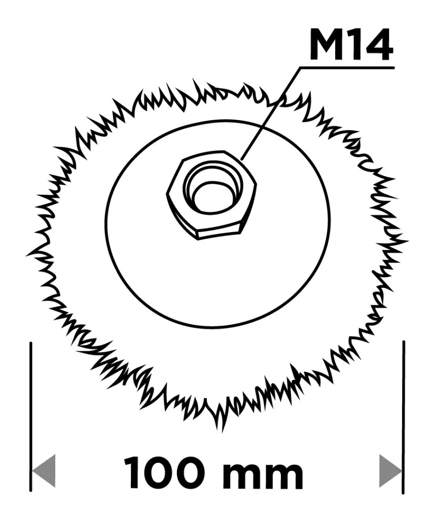 A GRAPHITE 100 mm átmérőjű drótkerékkefe, krimpelt acélhuzal, M14, 57T410 krimpelt acélhuzalból készül. M14-es menettel van ellátva, és sarokcsiszolókkal való használatra tervezték. A szerszám maximális fordulatszáma 12500 fordulat/perc. A termék megfelel az EN 1083-2 szabványnak, és kiválóan alkalmas fémfelületek megmunkálására, tisztítására, rozsda, festék vagy szennyeződés eltávolítására.