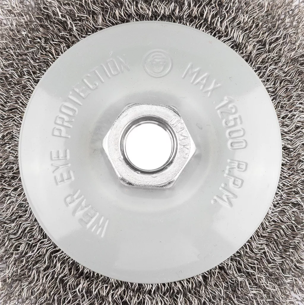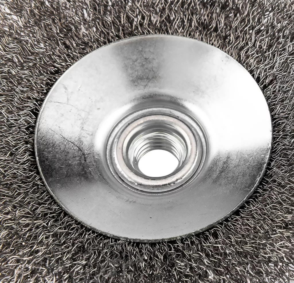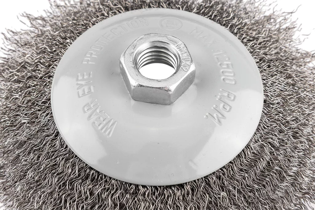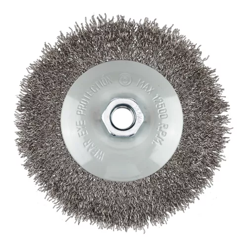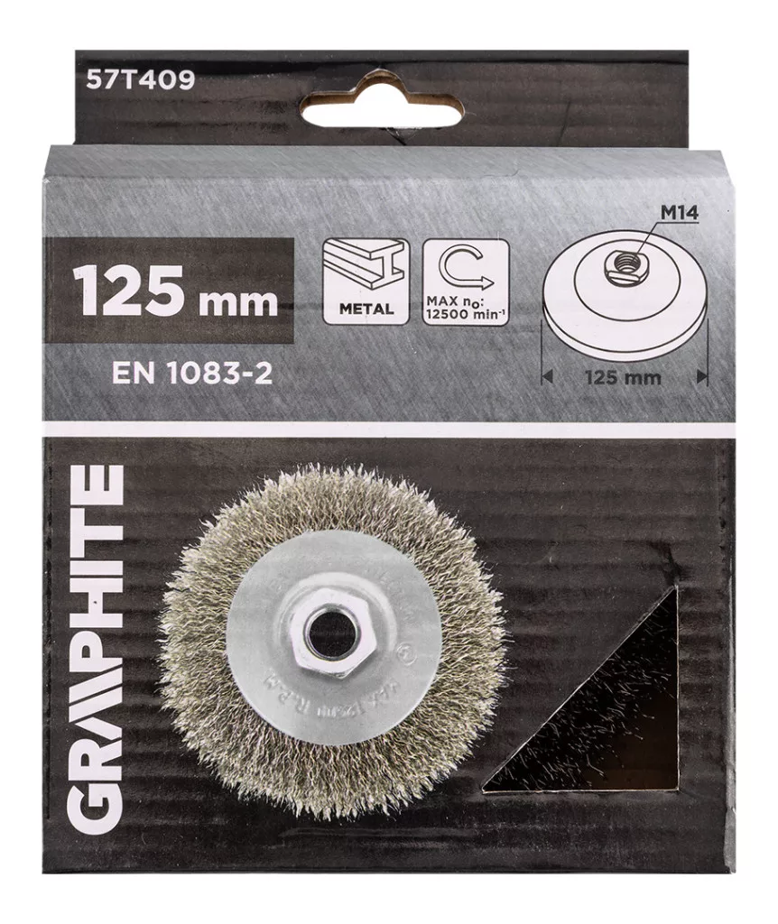 A GRAPHITE 125 mm átmérőjű GRAPHITE drótkerékkefe, krimpelt acélhuzal, M14, 57T409 a GRAPHITE-tól krimpelt acélhuzalból készült. M14-es menettel van ellátva, és sarokcsiszolókkal való használatra tervezték. A szerszám maximális fordulatszáma 12500 fordulat/perc. A termék megfelel az EN 1083-2 szabványnak, és kiválóan alkalmas fémfelületek megmunkálására, tisztítására, rozsda, festék vagy szennyeződés eltávolítására.