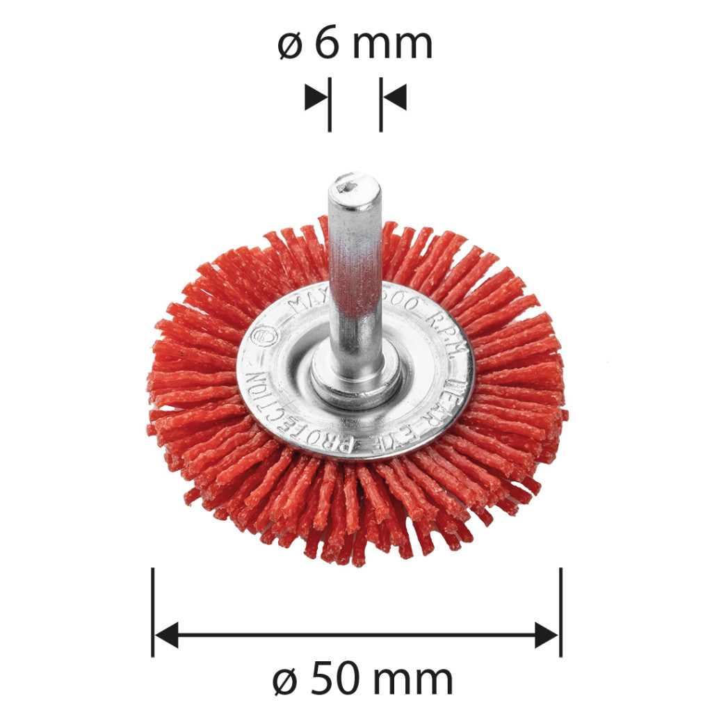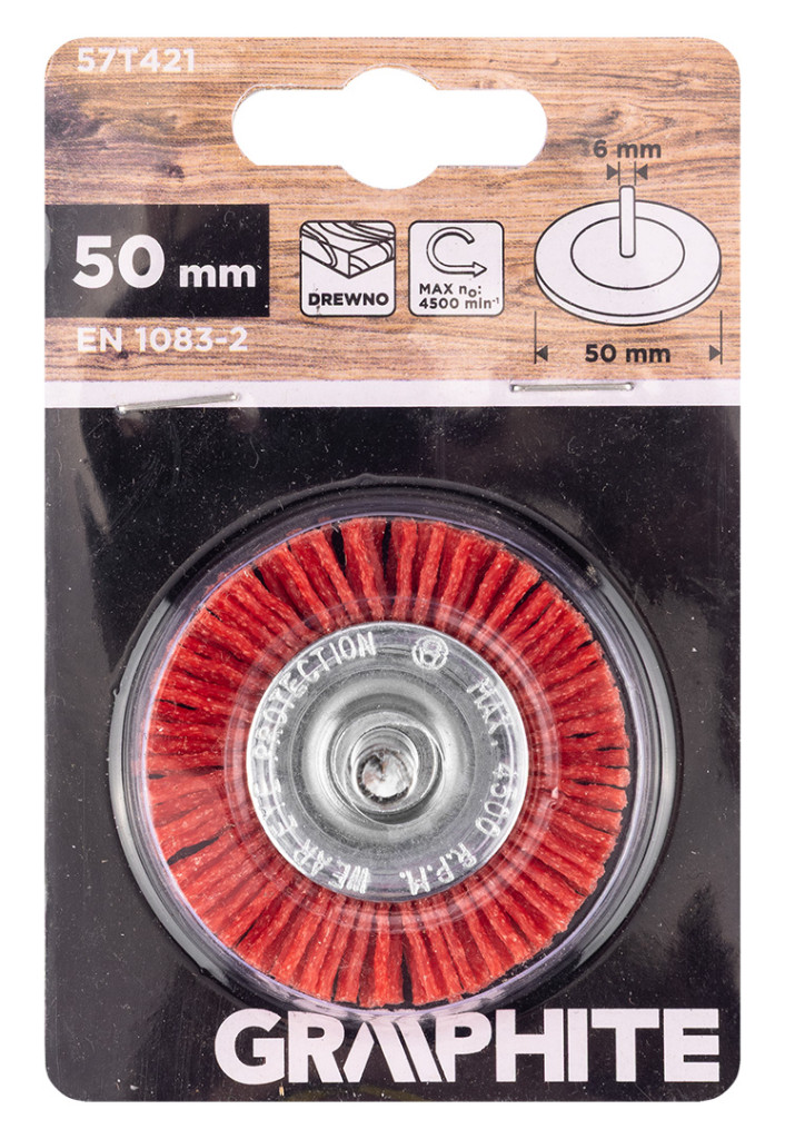A GRAPHITE 50 mm-es nejlon kerékkefe 6 mm-es szárral 57T421 nylonból készült. Maximális fordulatszáma 4500 fordulat/perc. A termék megfelel az EN 1083-2 szabvány követelményeinek, és 6 mm-es szárral rendelkezik, így bármilyen fúróval vagy csavarozógéppel használható. A GRAPHITE nejlonkefe sokoldalúan használható termék számos feladathoz.