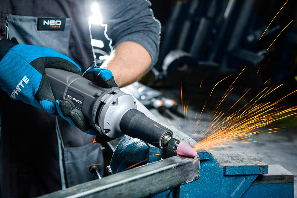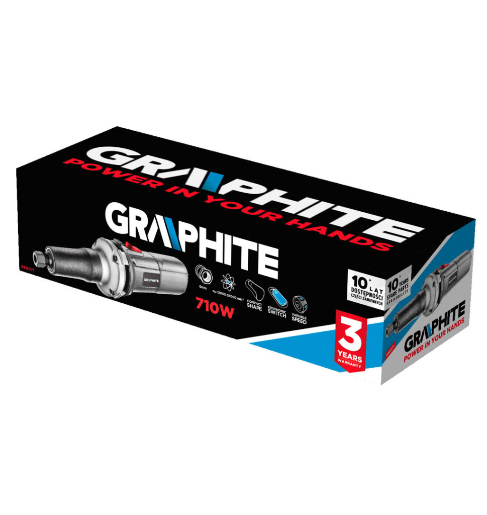 GRAPHITE egyenes csiszológép. 710 W-os motorral különféle keménységű és szerkezetű anyagok csiszolására és polírozására szolgál. Különösen nagy segítségre van a munkadarabok hegesztés utáni csiszolásában. Max csiszolófej átmérő 25 mm. A szerszám ergonómikus formakialakításának és precíz kiegyesúlyozásának köszönhetően nagyon komfortossá teszi a munkavégzést. A meghosszabbított orsó megkönnyíti a hozzáférést szűk terekben is. A csiszológép a biztonság érdekében a véletlen elindítást megakadályozó reteszeléssel van felszerelve, az orsóház pedig alumíniumötvözetből készült. A szellőzőnyílások megfelelő elosztása megakadályozva a motor túlmelegedését. Fel van szerelve fokozatmentes fordulatszám szabályzással. A tengely fordulatszáma 12 000 – 28 000 ford/perc. Szükség esetén az elhasználódott szénkefék saját kezűleg is kicserélhetők. A csiszológéphez mellékelve vannak a szerelőkulcsok. A CE tanúsítvány bizonyítja az európai szabványoknak való megfelelést.