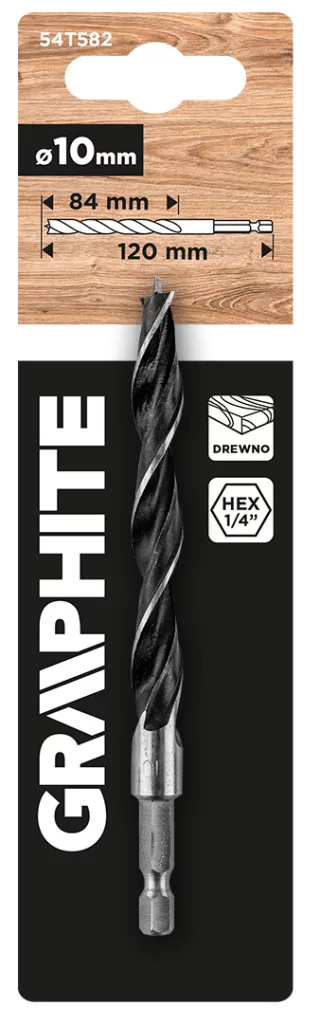GRAPHITE 54T582 Fafúró, 10mm, hatszög szárral. Fa és rétegelt lemez fúrására tervezve. Jellemzője a 2 mm átmérő és a 120 mm hosszúság. Alkalmas 1500 fordulat/perc maximális fordulatszámú használatra. Számos faipari és barkácsolási feladathoz jól használható.
