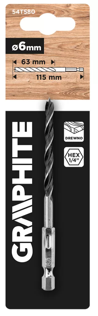 GRAPHITE Fafúró 1/4"-os hatszög szárral, 6 mm. Fa és rétegelt lemez megmunkálásához tervezték. Jellemzője a 6 mm átmérő és a 115 mm hosszúság. A feladatokhoz 2800 fordulat/perc maximális fordulatszámmal alkalmazkodik. Számos barkácsolási feladathoz jól használható.