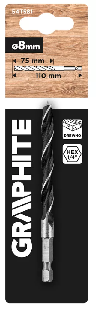 GRAPHITE 54T581 Fafúró, 8mm, hatszög szárral. Fa és rétegelt lemez fúrására tervezve. Jellemzője a 2 mm átmérő és a 110 mm hosszúság. Alkalmas 1500 fordulat/perc maximális fordulatszámú használatra. Számos faipari és barkácsolási feladathoz jól használható.