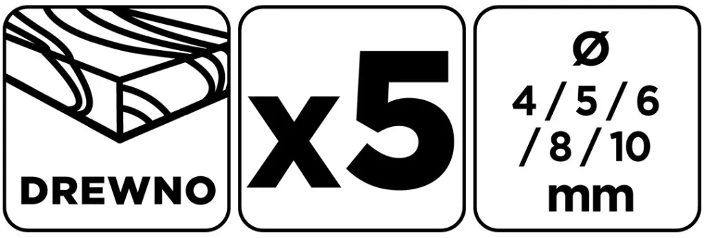 GRAPHITE 54T574 FAFÚRÓ KÉSZLET, 5DB-OS, 4-10MM. 4, 5, 6, 8, 10 mm átmérőjű fúrók, hengeres szárral. Különböző mélységű fúrásokat tesznek lehetővé fában és rétegelt lemezben. Jellemzőjük a 75 és 120 mm közötti teljes hossz és az egyes átmérőkhöz tartozó maximális fordulatszám: 4 mm - 1800 rpm, 5 mm - 1700 rpm, 6 mm - 1400 rpm, 8 mm - 900 rpm, 10 mm - 700 rpm. Számos barkácsprojekthez jól használhatóak.