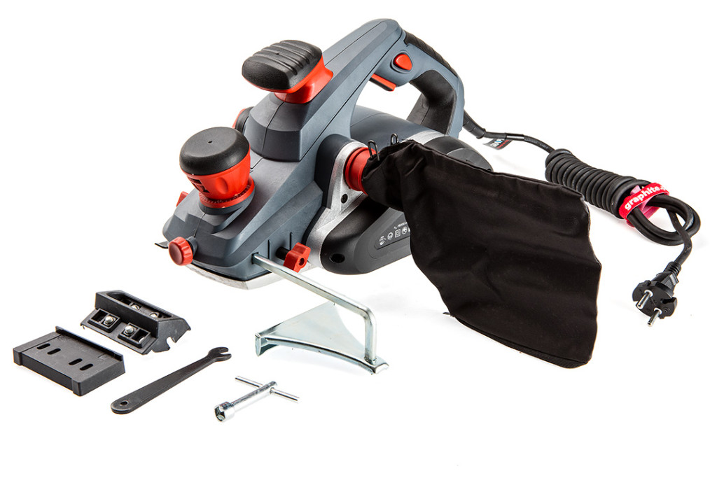 GRAPHITE gyalugép, 1300 W . Nehéz asztalos és ácsmunkákhoz tervezve. A szerszámot korszerű formatervezés és ergonómikus formakialakítás jellemzi. A masszív alumínium talp ellenáll a deformálódásnak. Fogásszélessége állandó, 110 mm, forgácsolási mélysége max. 3,5 mm. Fogásmélysége horonygyalulásnál (falcolásnál) 0-14 mm. A késhenger két gyalukéssel van felszerelve, melyek jóval hosszabbak a standard gyalugépekben megszokottaknál. A gép motorja max. 16 000 perc⁻¹ fordulatszám elérését teszi lehetővé a késhenger számára. A főmarkolat, a segédmarkolat és a forgácsolási mélységet szabályozó marokcsavar csúszásmentes bevonatának köszönhetően biztos a gyalu fogása. A gyalu fel van szerelve automatikus "parkoló talp" kiengedési megoldással és a véletlen elindítást megakadályozó reteszeléssel. A forgács nem marad az alumínium talp alatt, mivel automatikusan kidobódik jobb- vagy baloldalra. A három V-alakú horonynak köszönhetően a gyalu alkalmas peremek megmunkálására is. A gyalukések otthoni körülmények között is élezhetők. Az elektromos kézigyaluhoz mellékelt tartozékok: porzsák, párhuzamvezető, támaszték, falcolásvezető, valamint késélező szerszám. A CE tanúsítvány bizonyítja az európai szabványoknak való megfelelést.Kézigyalu 1 300 W, gyalulási mélység 0-3,5 mm, fordulatszám 16 000 perc-1, gyalulási szélesség 110 mm, kések száma 2, falcolás 0-14 mm, (HxM) 340 x 195 mm, tömeg 5 kg, tartozékok: porzsák, villáskulcs, párhuzamvezető és tartósín, vezetőléc falcoláshoz, dugókulcs, késélesítő szerszám, adapter forgácselszívás csatlakoztatásához