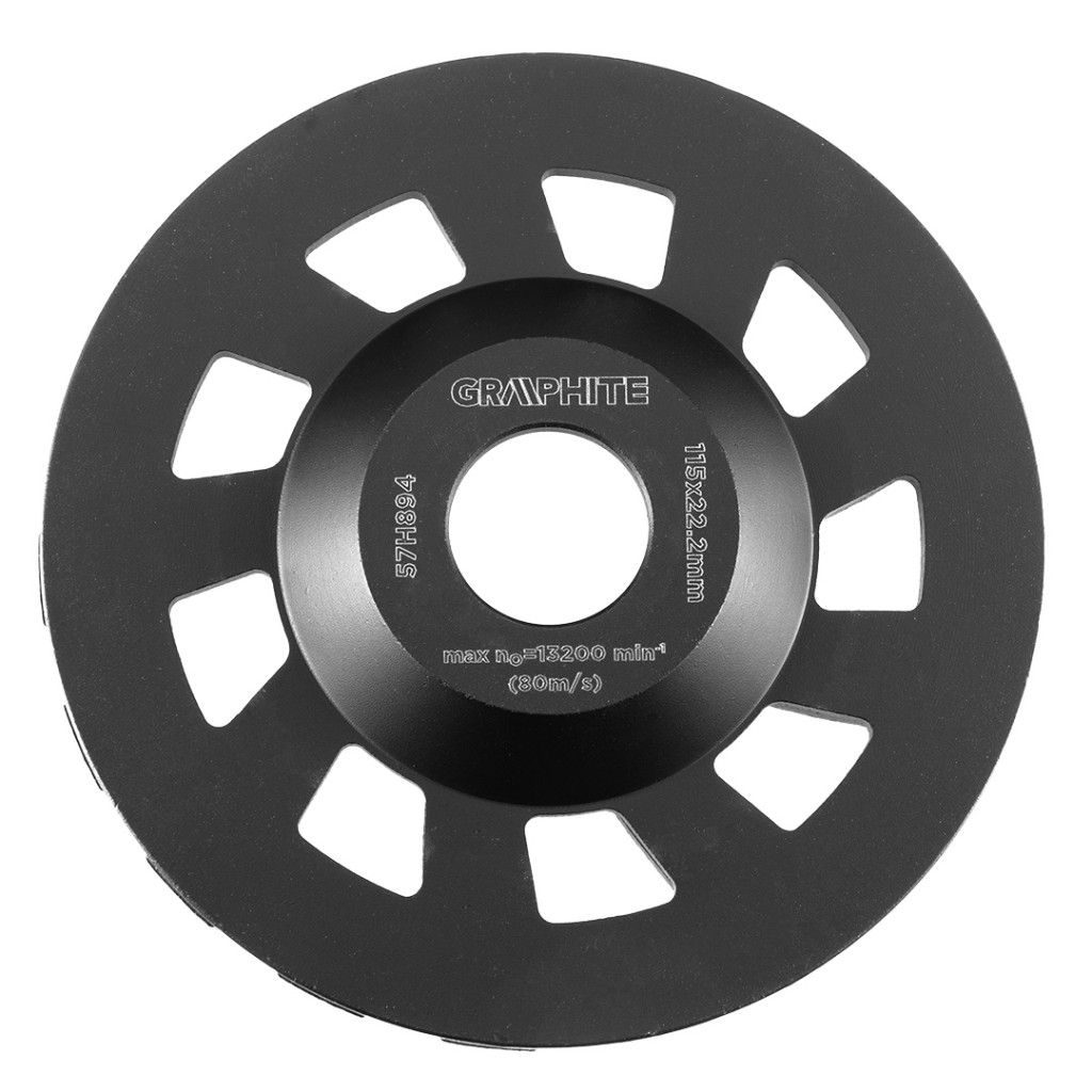 115 x 22,2 x 5 mm, C-szegmens. A GRAPHITE gyémántcsiszolókorong kemény anyagokhoz, különösen betonhoz és kőhöz. Átmérője 115 mm, C-szegmenssel rendelkezik, ami gyors eredmények elérésére alkalmasabbá teszi. A lemez a hőelvezetésnek köszönhetően lassan melegszik fel. A maximális sebesség 80 m/sec. Ideális vágáshoz és csiszoláshoz.
