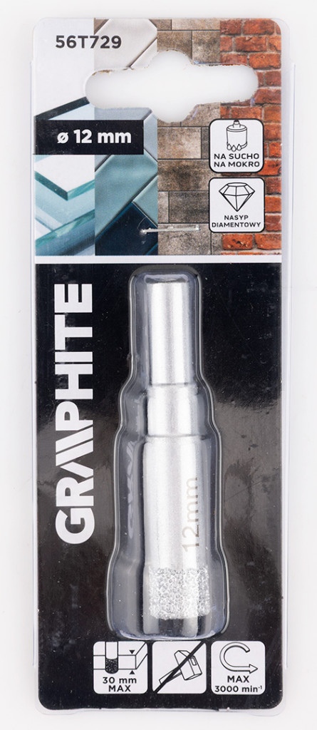 A GRAPHITE 12 mm-es 56T729 gyémánt lyukfűrészének keményforrasztott gyémánttal és hengeres szárral rendelkezik. Hatékony fúráshoz tervezték kőedényekben, kerámiákban, üvegben és téglában. Nedvesen vagy szárazon is dolgozhat, és maga a fúrás ütés nélkül történik. A lyukfűrész maximális fordulatszáma 3000 rpm, míg a maximális fúrási mélysége 30 mm. A GRAPHITE márkájú szerszámot fúrógép vagy csavarozógép segítségével történő fúráshoz tervezték.