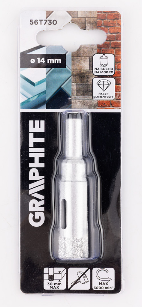 A GRAPHITE 14 mm-es 56T730 gyémánt lyukfűrészének keményforrasztott gyémánttal és hengeres szárral rendelkezik. Hatékony fúráshoz tervezték kőedényekbe, kerámiába, üvegbe és téglába. Nedvesen vagy szárazon is dolgozhat, és maga a fúrás ütés nélkül történik. A lyukfűrész maximális fordulatszáma 3000 rpm, míg a maximális fúrási mélysége 30 mm. A GRAPHITE márkájú szerszámot fúrógép vagy csavarozógép segítségével történő fúráshoz tervezték.