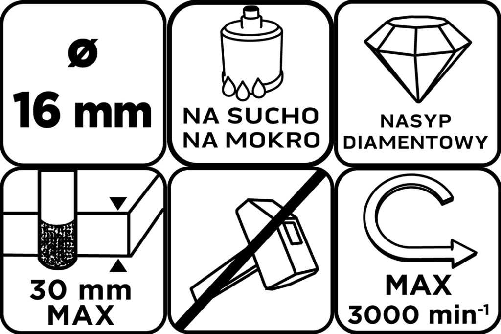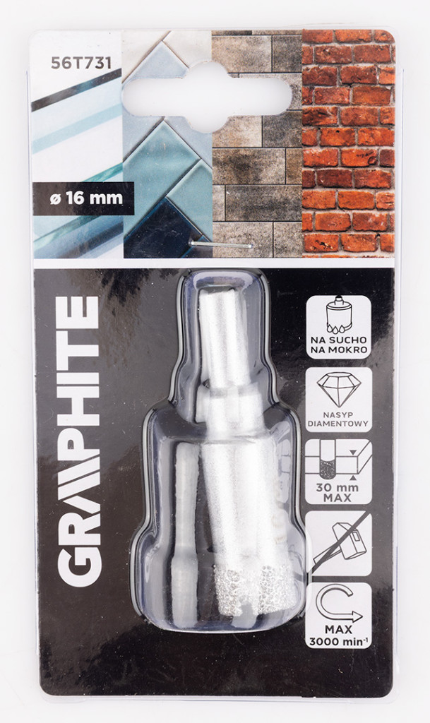 A GRAPHITE 16 mm-es 56T731 gyémánt lyukfűrészének keményforrasztott gyémánttal és hengeres szárral rendelkezik. Hatékony fúráshoz tervezték kőedényekben, kerámiákban, üvegben és téglában. Nedvesen vagy szárazon is dolgozhat, és maga a fúrás ütés nélkül történik. A lyukfűrész maximális fordulatszáma 3000 rpm, míg a maximális fúrási mélysége 30 mm. A GRAPHITE márkájú szerszámot fúrógép vagy csavarozógép segítségével történő fúráshoz tervezték.