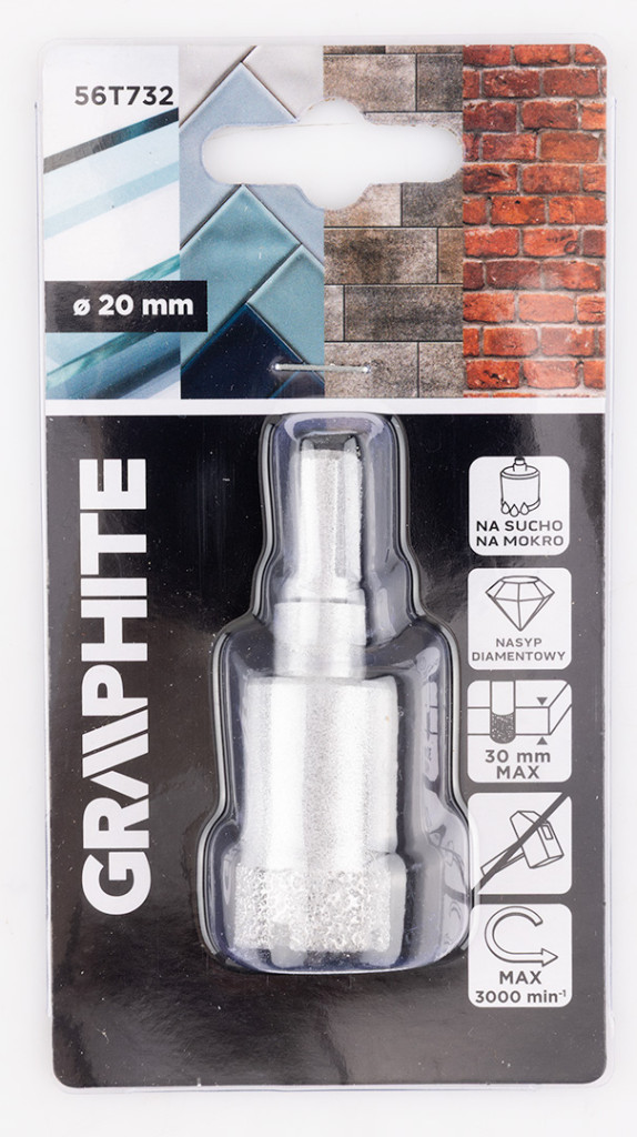 A GRAPHITE 20 mm-es 56T732 gyémánt lyukfűrészének keményforrasztott gyémánt blankja és hengeres szára van. Hatékony fúráshoz tervezték kőedényekben, kerámiákban, üvegben és téglában. Nedvesen vagy szárazon is dolgozhat, és maga a fúrás ütés nélkül történik. A lyukfűrész maximális fordulatszáma 3000 rpm, míg a maximális fúrási mélysége 30 mm. A GRAPHITE márkájú szerszámot fúrógép vagy csavarozógép segítségével történő fúráshoz tervezték.
