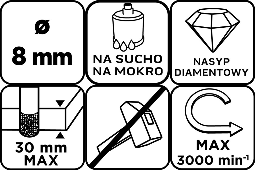 A GRAPHITE 8 mm-es 56T727 gyémánt lyukfűrészének keményforrasztott gyémánttal és hengeres szárral rendelkezik. Hatékony fúráshoz tervezték kőedényekben, kerámiákban, üvegben és téglában. Nedvesen vagy szárazon is dolgozhat, és maga a fúrás ütés nélkül történik. A lyukfűrész maximális fordulatszáma 3000 rpm, míg a maximális fúrási mélysége 30 mm. A GRAPHITE márkájú szerszámot fúrógép vagy csavarozógép segítségével történő fúráshoz tervezték.